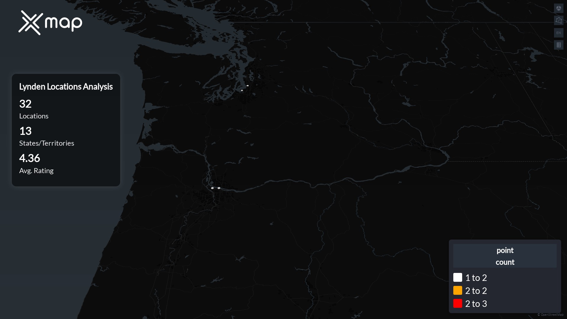 Street-level clusters show corridors where multiple Lynden locations sit within the same neighborhood indicating strong local presence and coherence. Lynden operates a total of 32 nationwide.