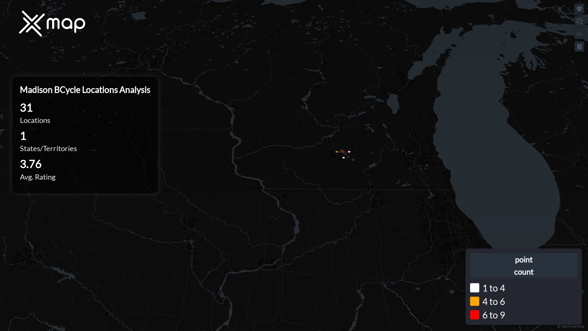 Street-level clusters show corridors where multiple Madison BCycle locations sit within the same neighborhood indicating strong local presence and coherence. Madison BCycle operates a total of 31 nationwide.