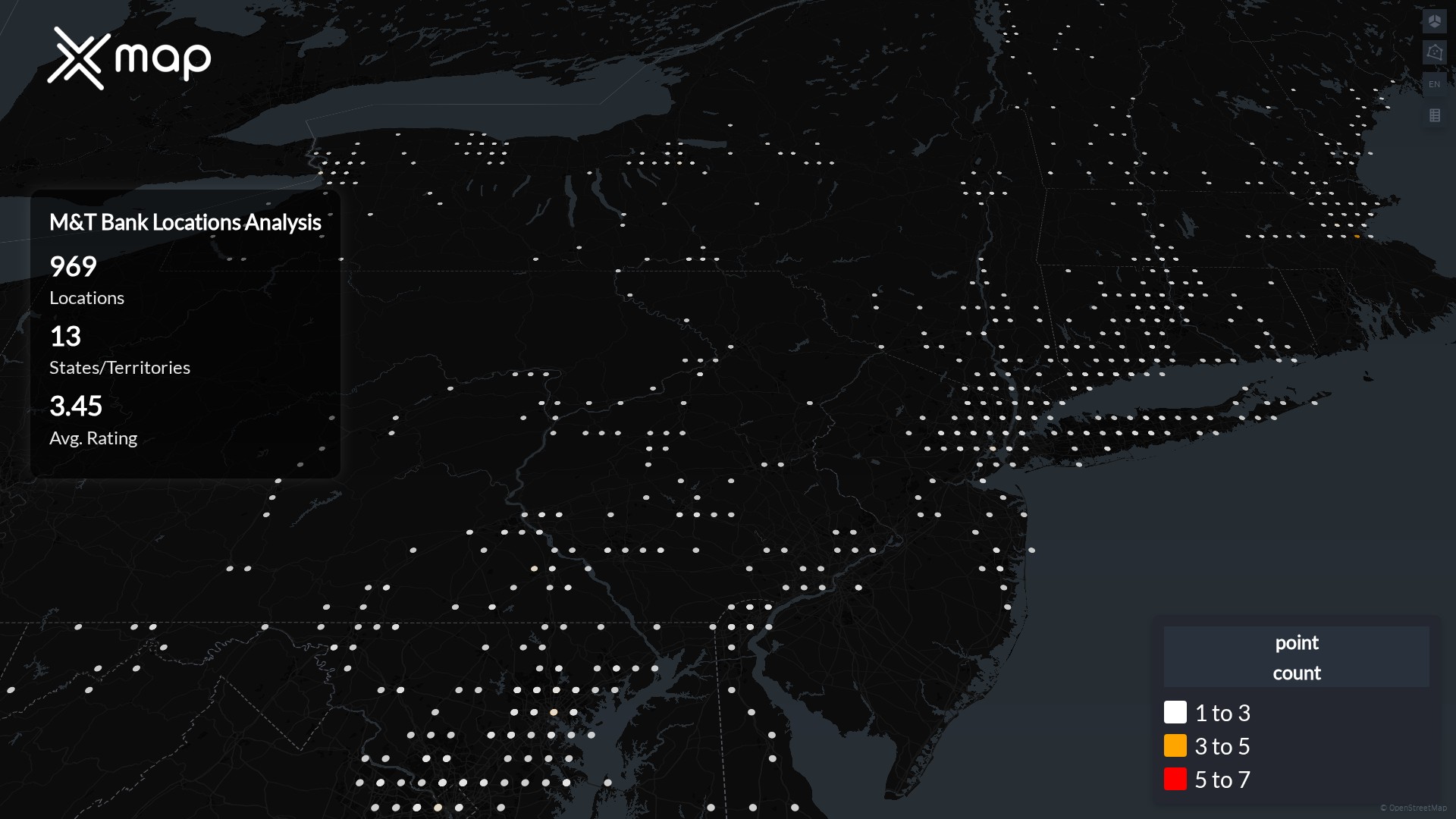 Street-level clusters show corridors where multiple M&T Bank locations sit within the same neighborhood indicating strong local presence and coherence. M&T Bank operates a total of 969 nationwide.