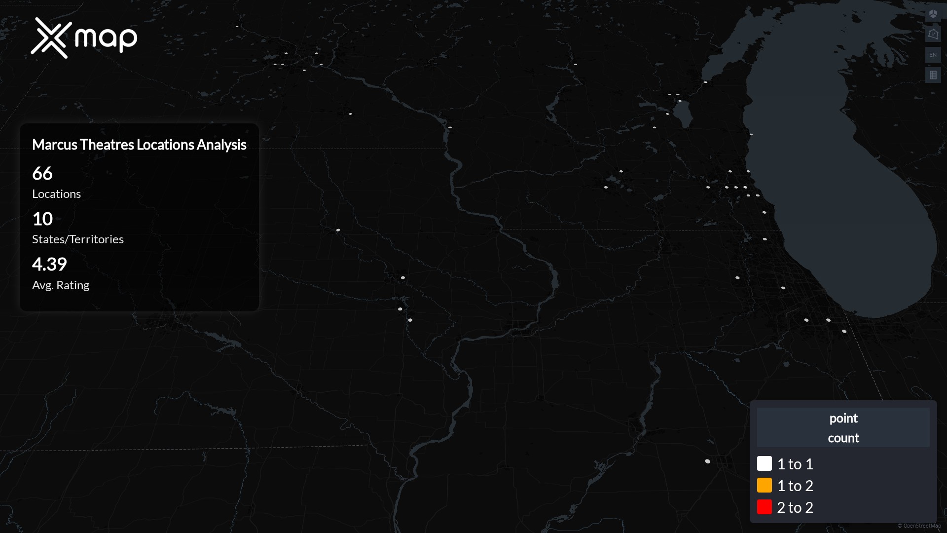 Street-level clusters show corridors where multiple Marcus Theatres locations sit within the same neighborhood indicating strong local presence and coherence. Marcus Theatres operates a total of 66 nationwide.