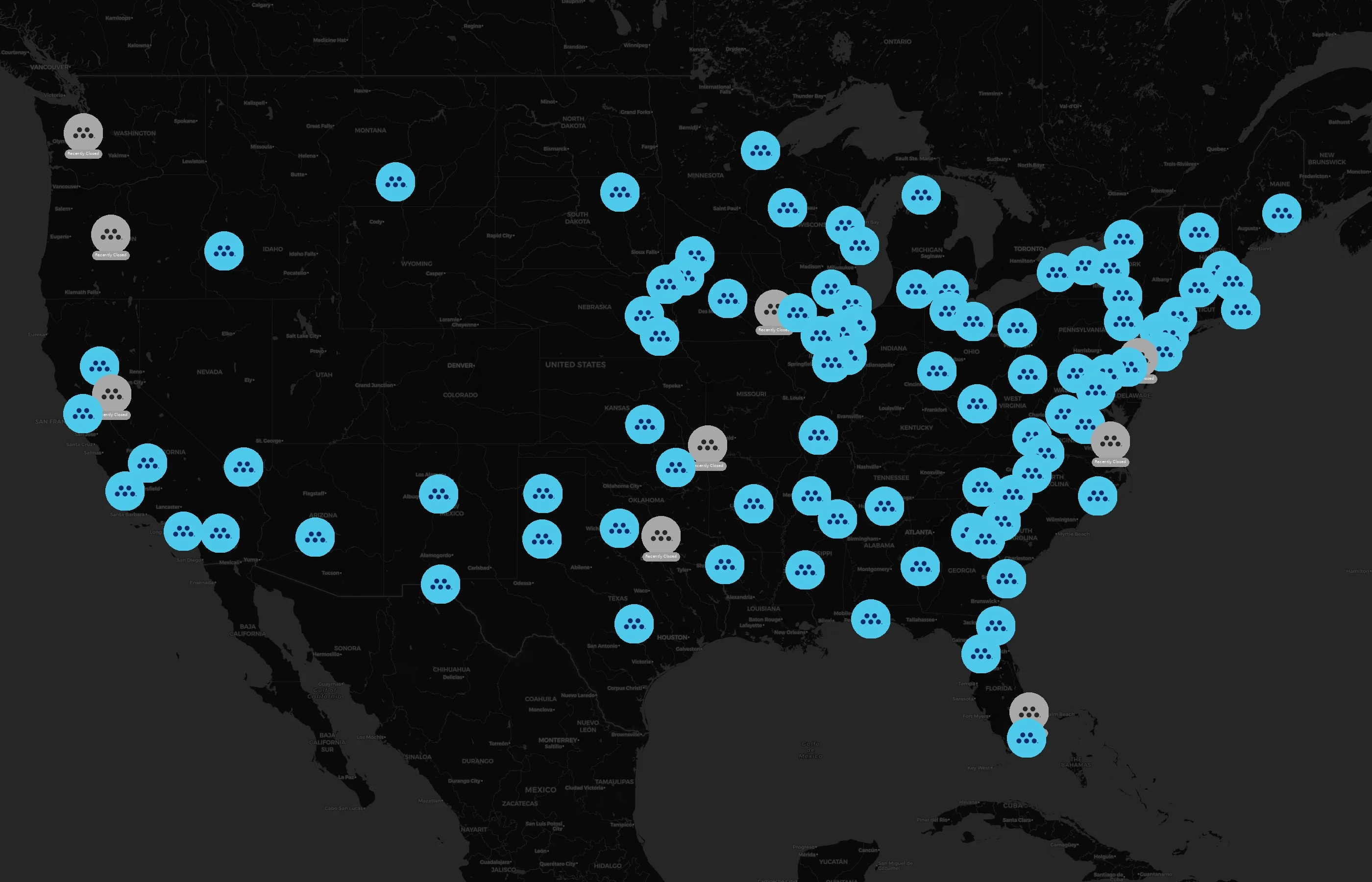 Locations concentrate around major metros such as Erie, Sedgwick, Hillsborough, Travis, and Shelby. The top 10 cities account for 16.4% of U.S. sites.