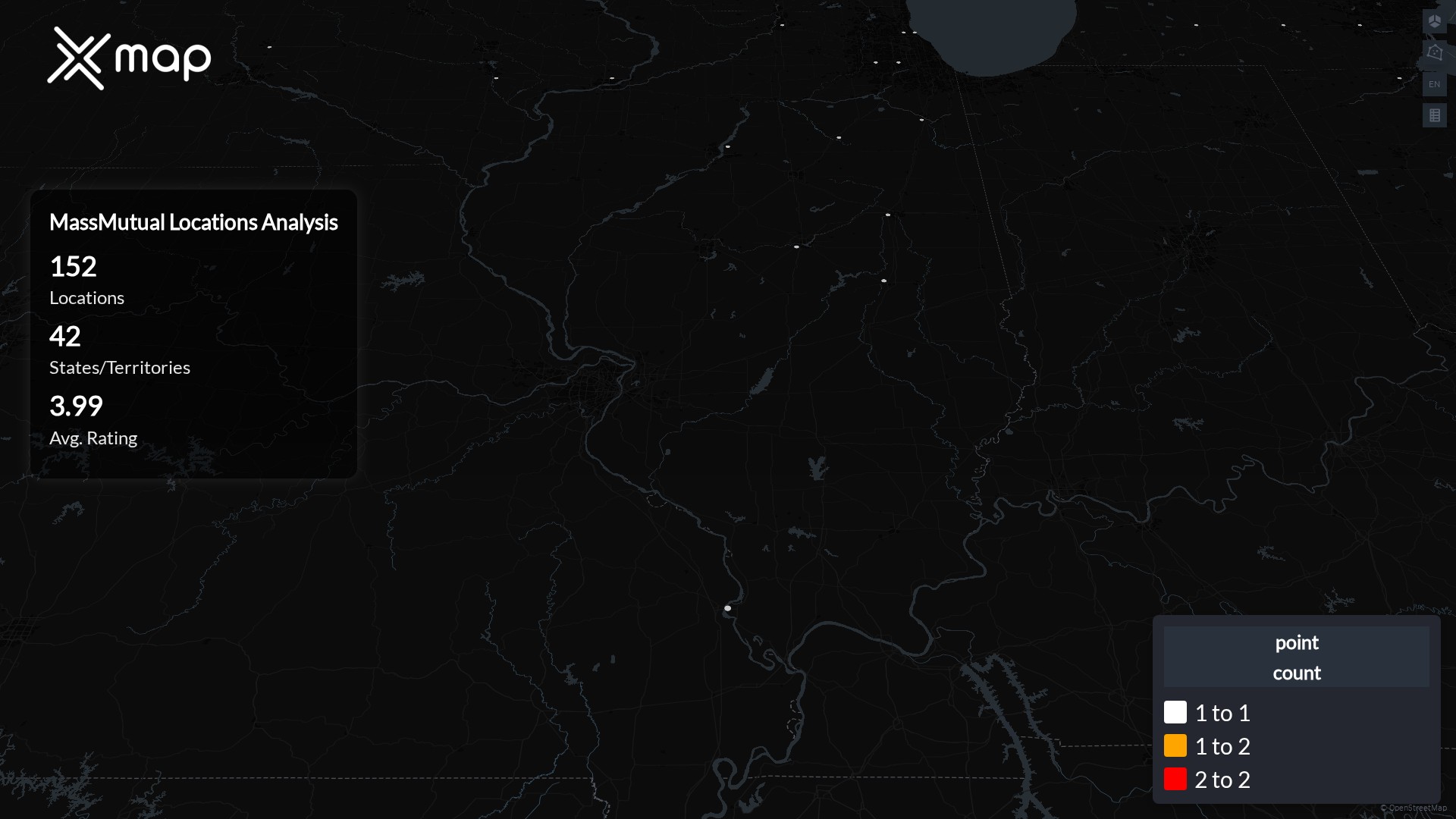 Street-level clusters show corridors where multiple MassMutual locations sit within the same neighborhood indicating strong local presence and coherence. MassMutual operates a total of 152 nationwide.