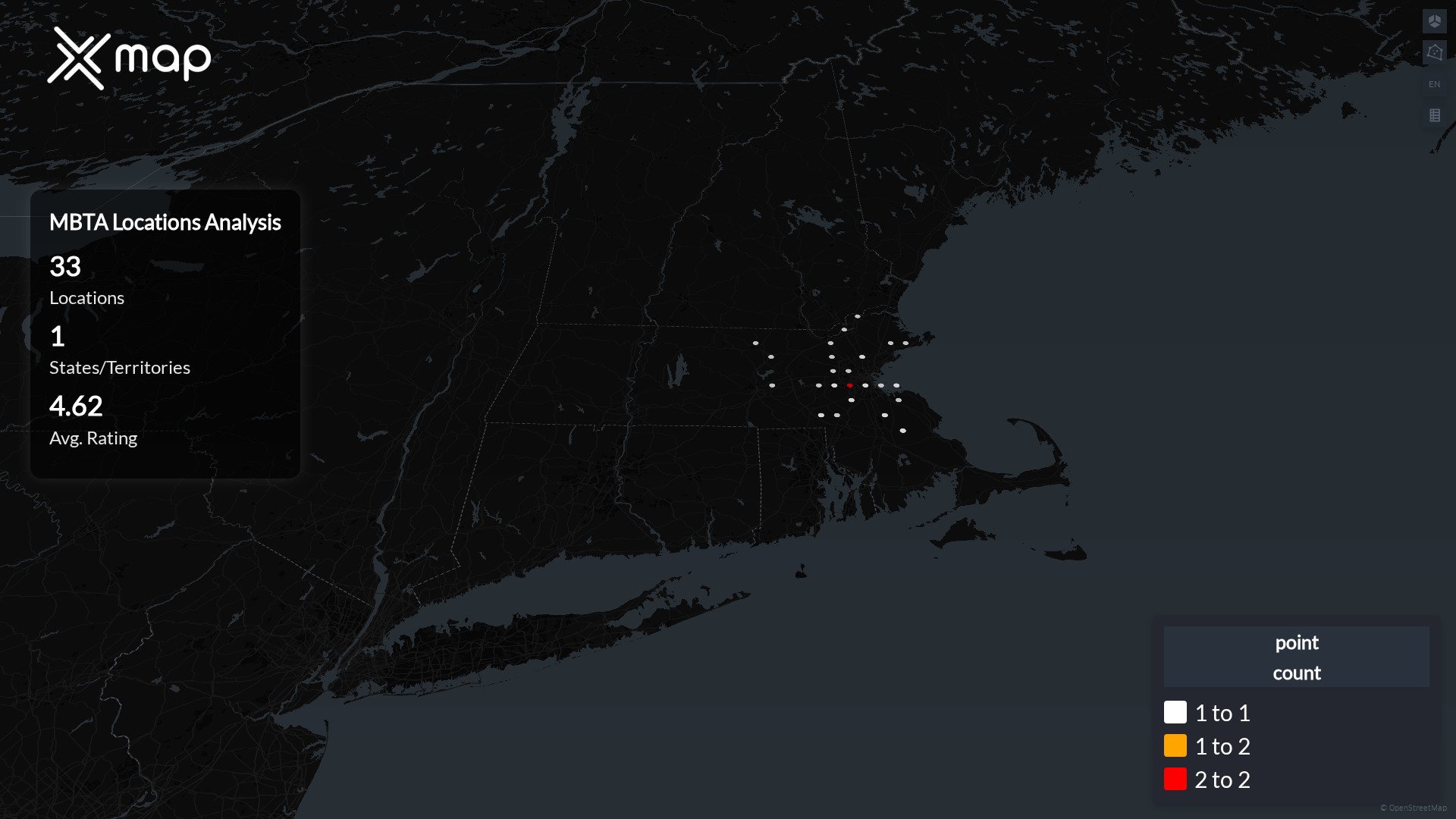Street-level clusters show corridors where multiple MBTA locations sit within the same neighborhood indicating strong local presence and coherence. MBTA operates a total of 33 nationwide.