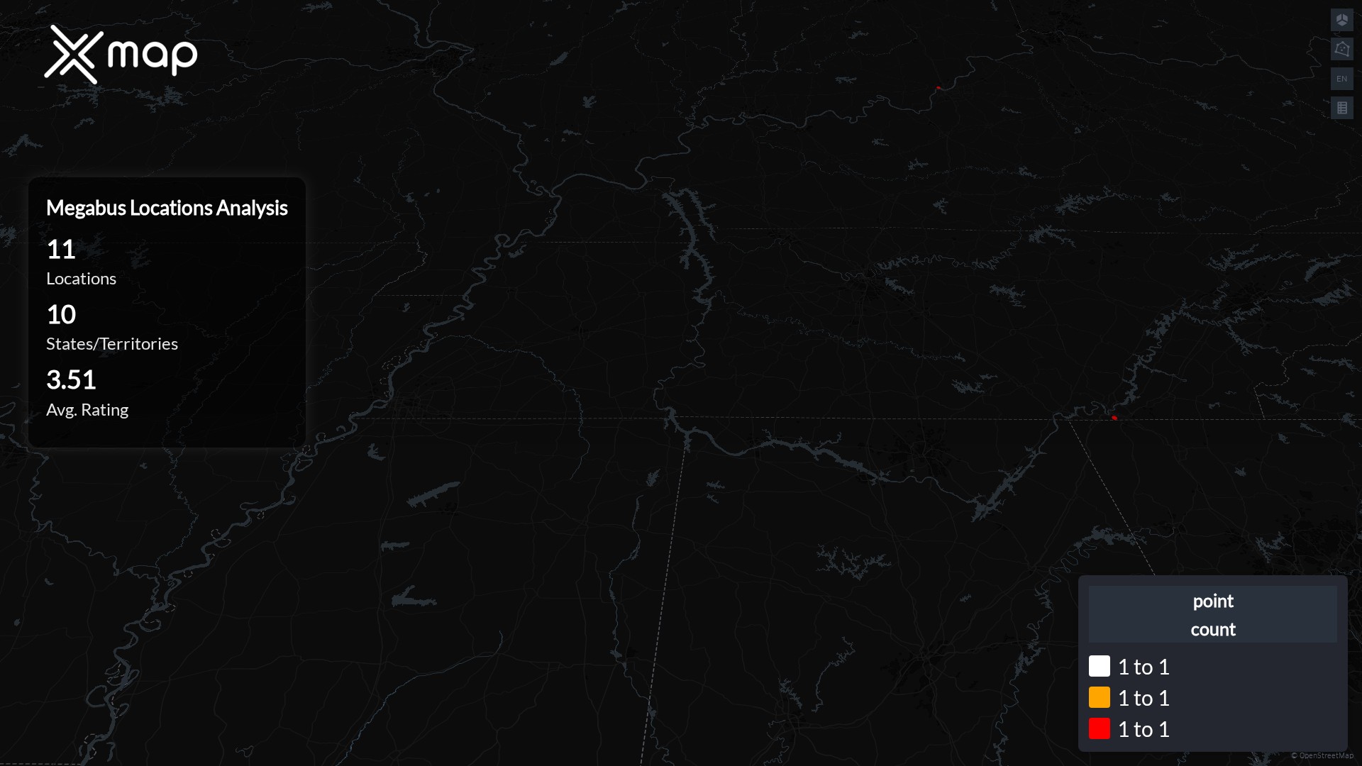 Street-level clusters show corridors where multiple Megabus locations sit within the same neighborhood indicating strong local presence and coherence. Megabus operates a total of 11 nationwide.