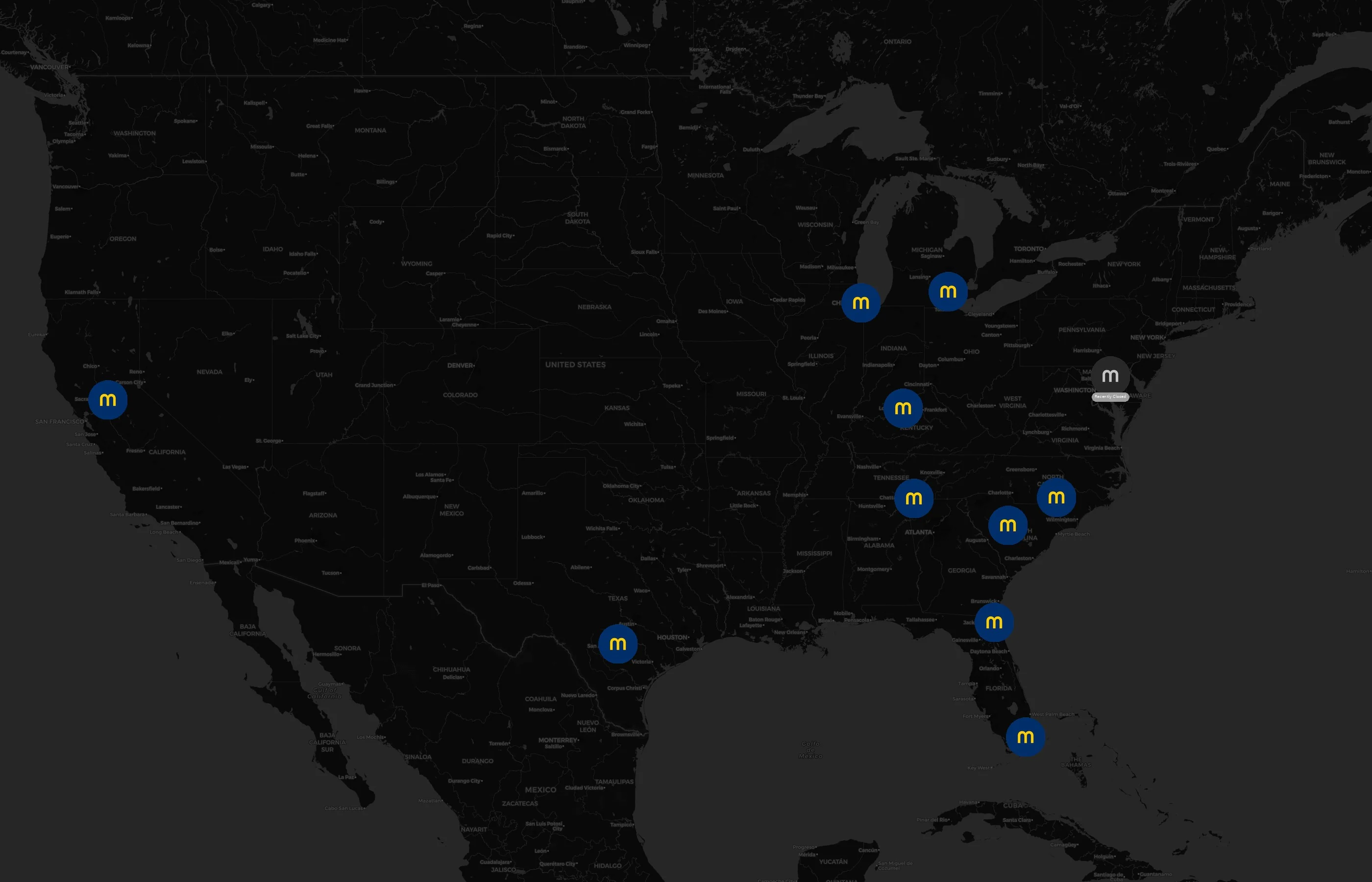 Locations concentrate around major metros such as Baltimore, Bexar, Cook, Cumberland, and Duval. The top 10 cities account for 90.9% of U.S. sites.