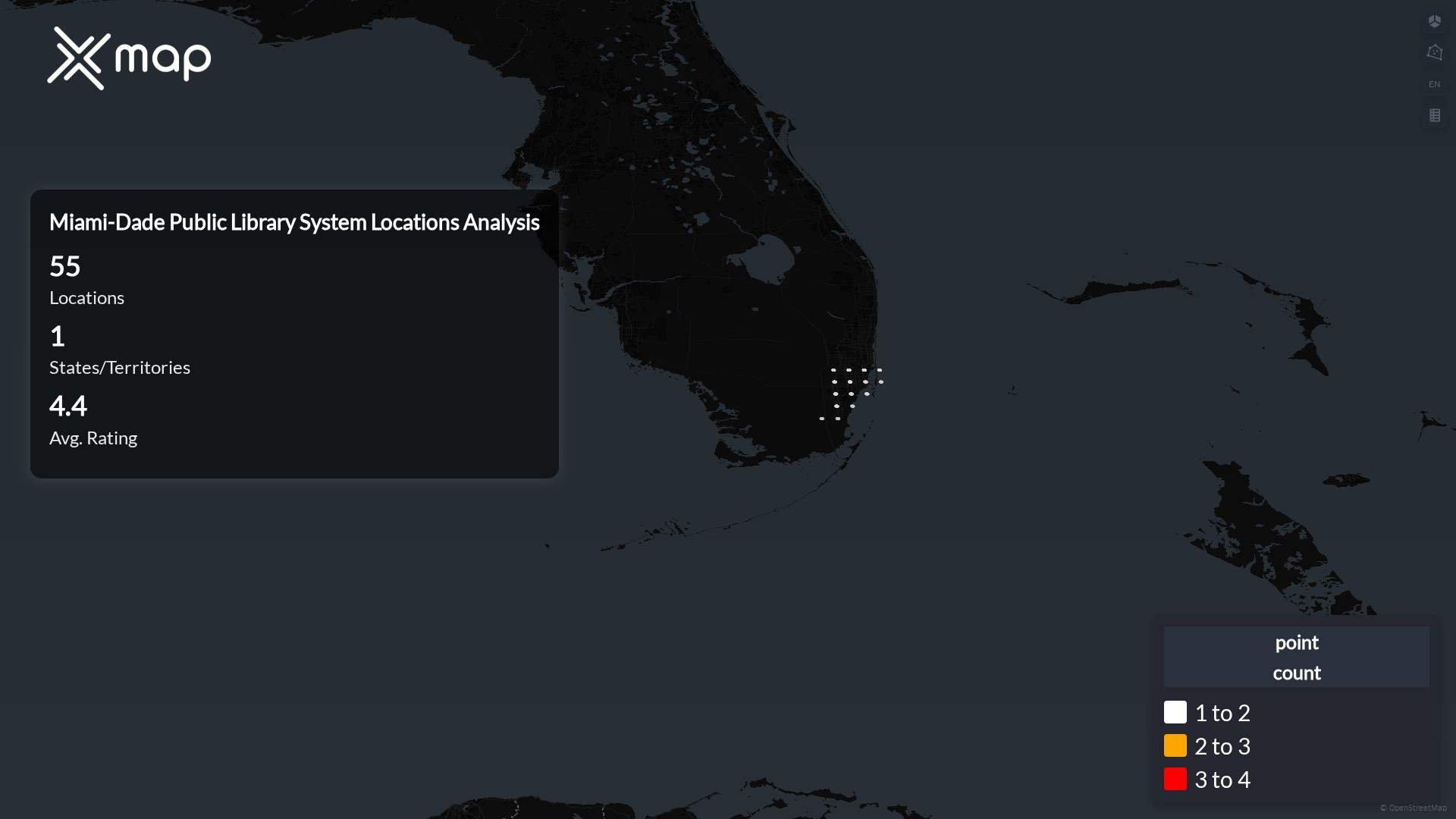Street-level clusters show corridors where multiple Miami-Dade Public Library System locations sit within the same neighborhood indicating strong local presence and coherence. Miami-Dade Public Library System operates a total of 55 nationwide.