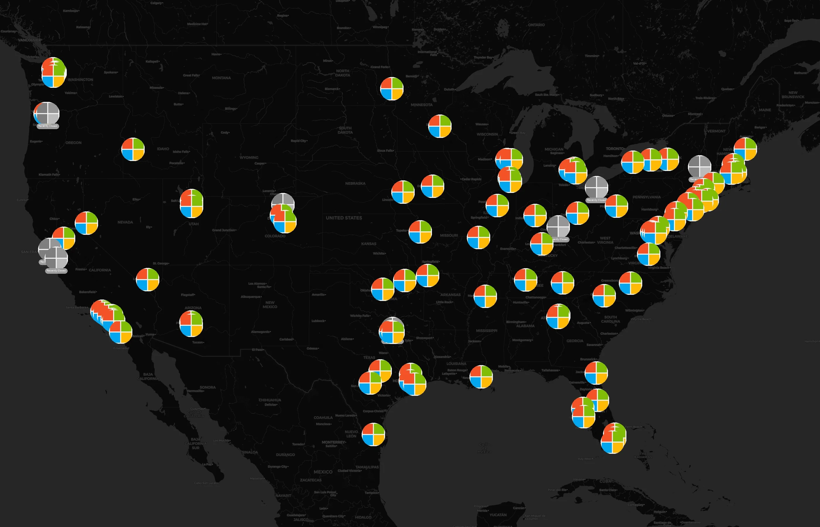 In the United States, Microsoft has the highest proportion of open businesses in Washington, with 60.0% (18 out of 30) remaining operational. California and Texas show lower open rates at 23.8% and 28.6%, respectively. Florida has the lowest open percentage at 10.0%, while Virginia stands out with a balanced 50.0% open rate among its six total businesses.