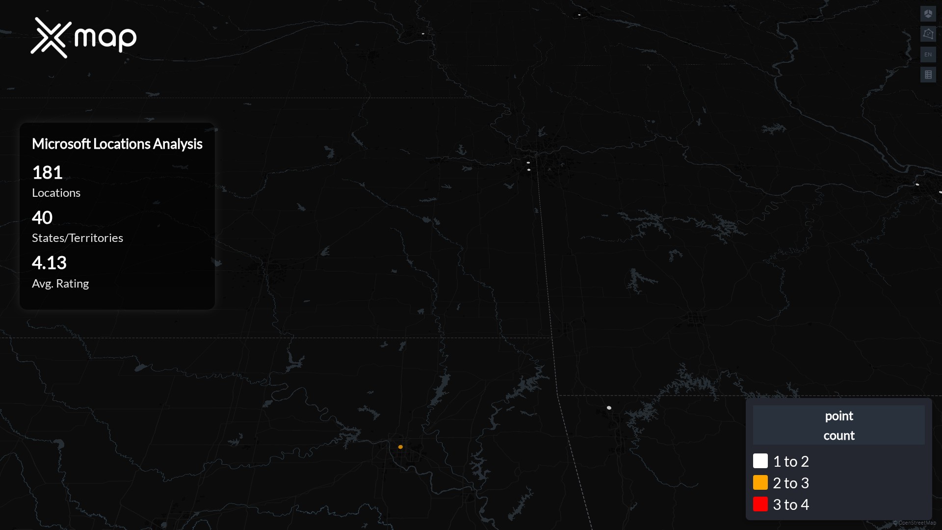 Microsoft POI data enables clear measurement of footprint and demand. Analysts can rank states and cities by location count, compare coverage on a per-capita basis, and use traffic scores and review volumes to spot high-performing markets and under-served pockets. The result is an objective view of saturation, growth opportunities, and performance outliers.