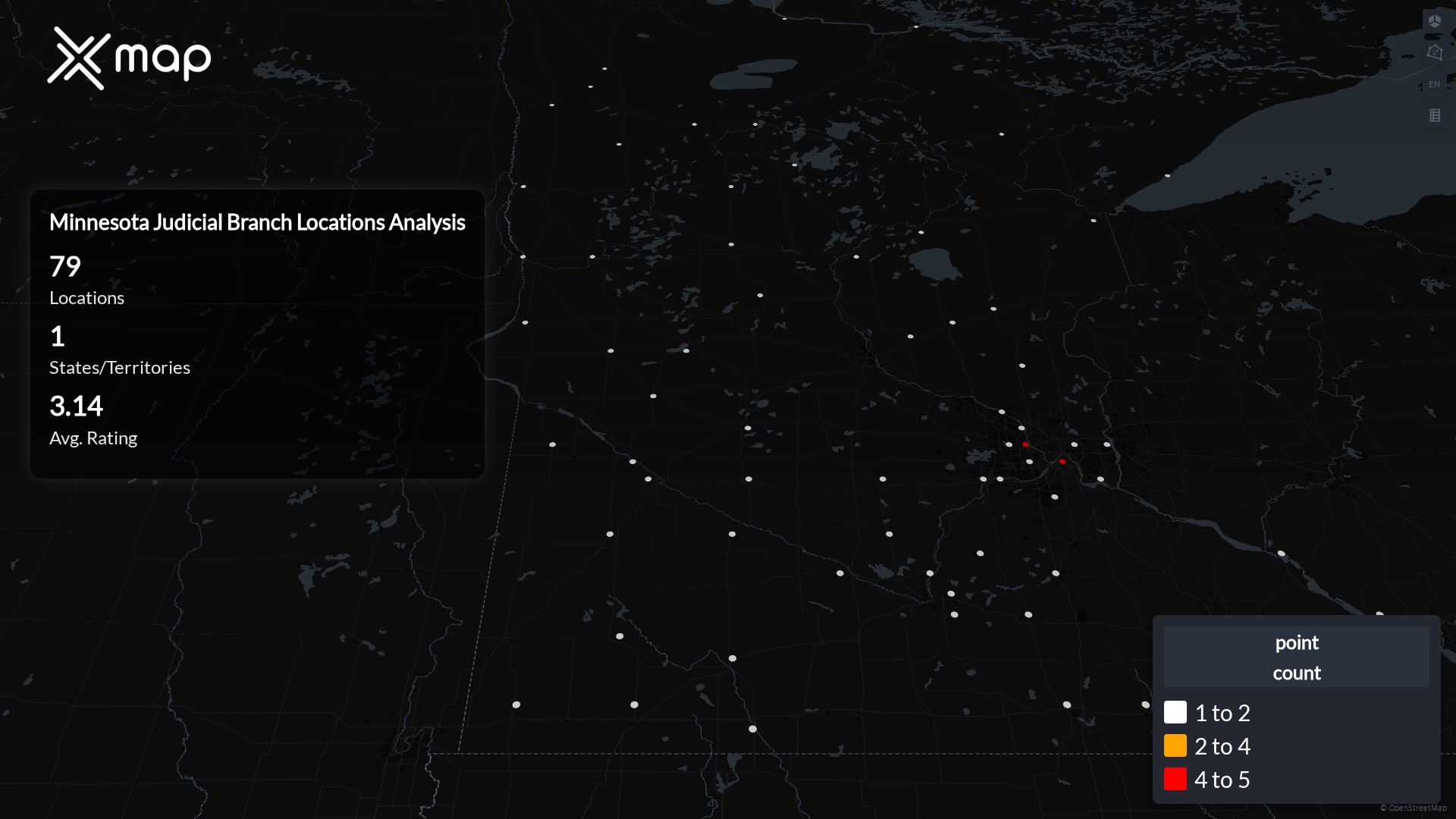 Minnesota Judicial Branch operates 79 United States of America locations across 1 states. Largest clusters are in Minnesota; the top 10 states contain 100.0% of sites. Coverage is thinner in Minnesota.