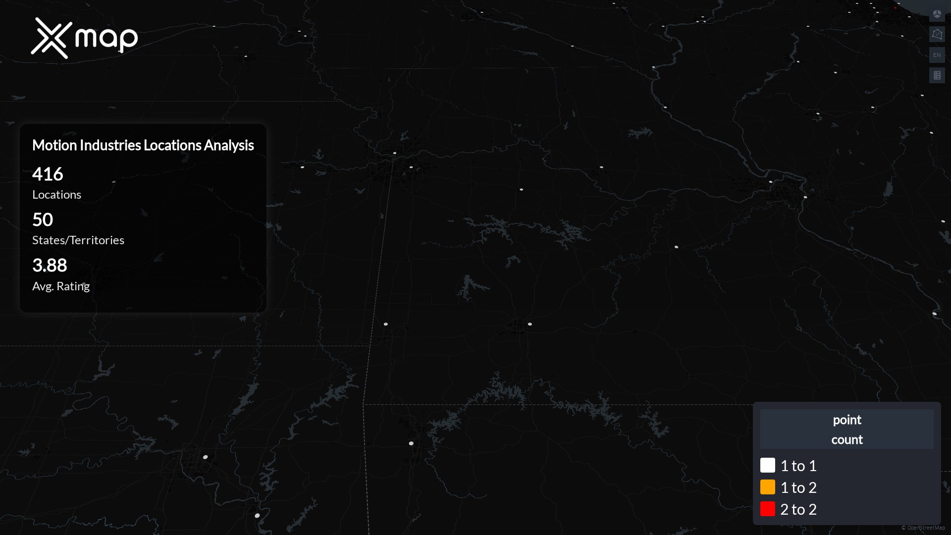 Motion Industries POI data enables clear measurement of footprint and demand. Analysts can rank states and cities by location count, compare coverage on a per-capita basis, and use traffic scores and review volumes to spot high-performing markets and under-served pockets. The result is an objective view of saturation, growth opportunities, and performance outliers.