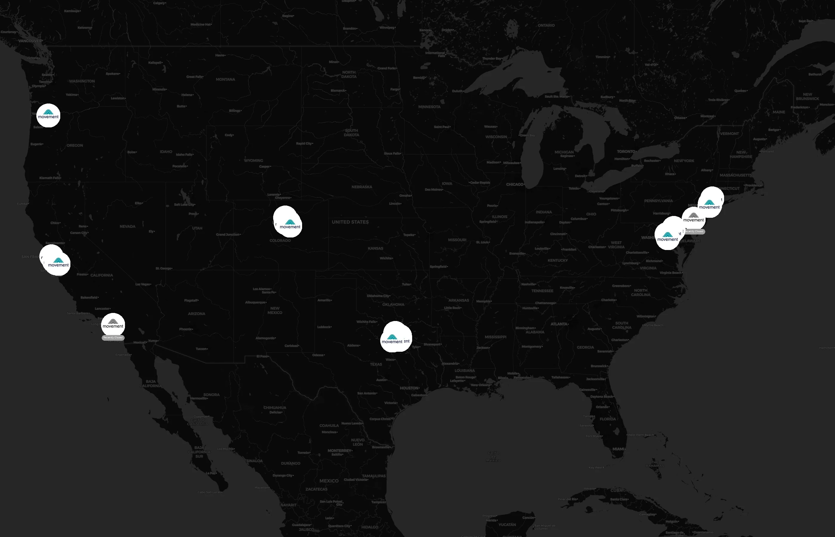 Street-level clusters show corridors where multiple Movement locations sit within the same neighborhood indicating strong local presence and coherence. Movement operates a total of 29 nationwide.
