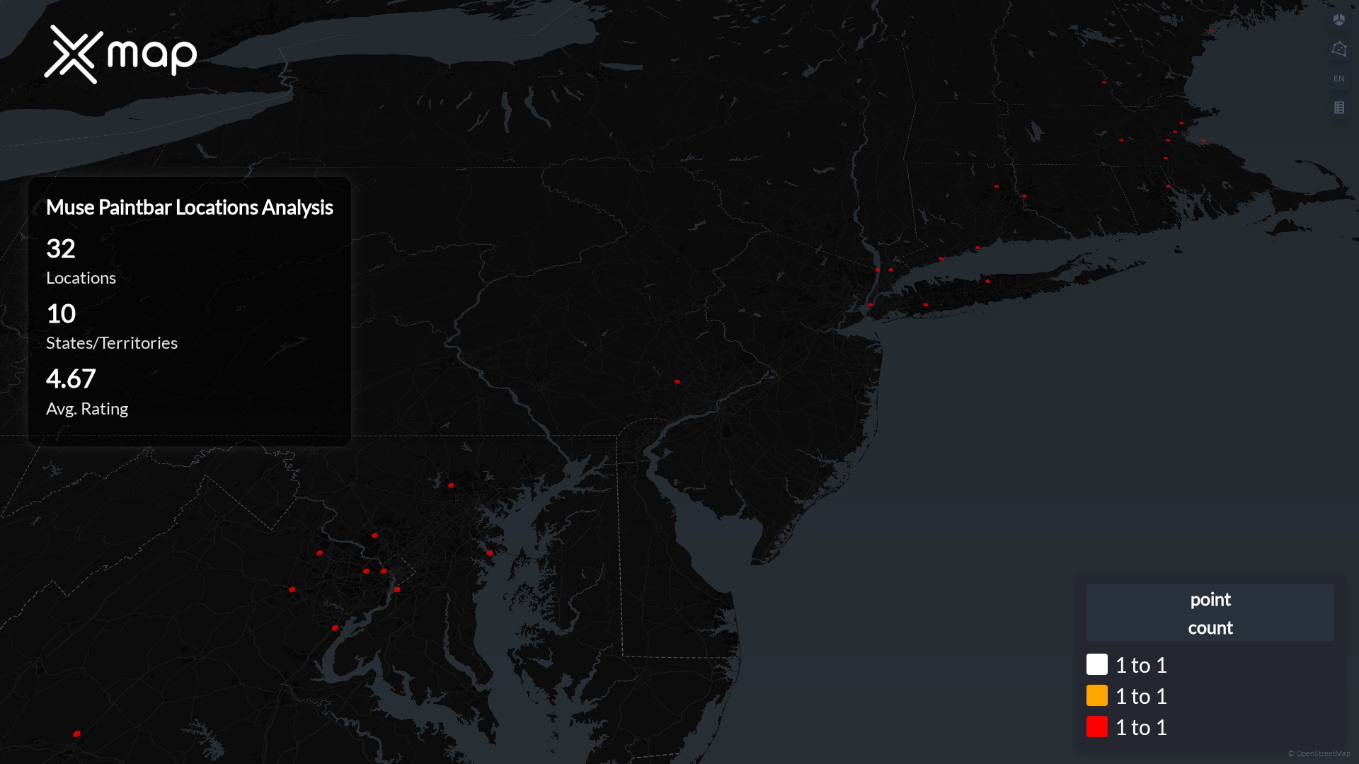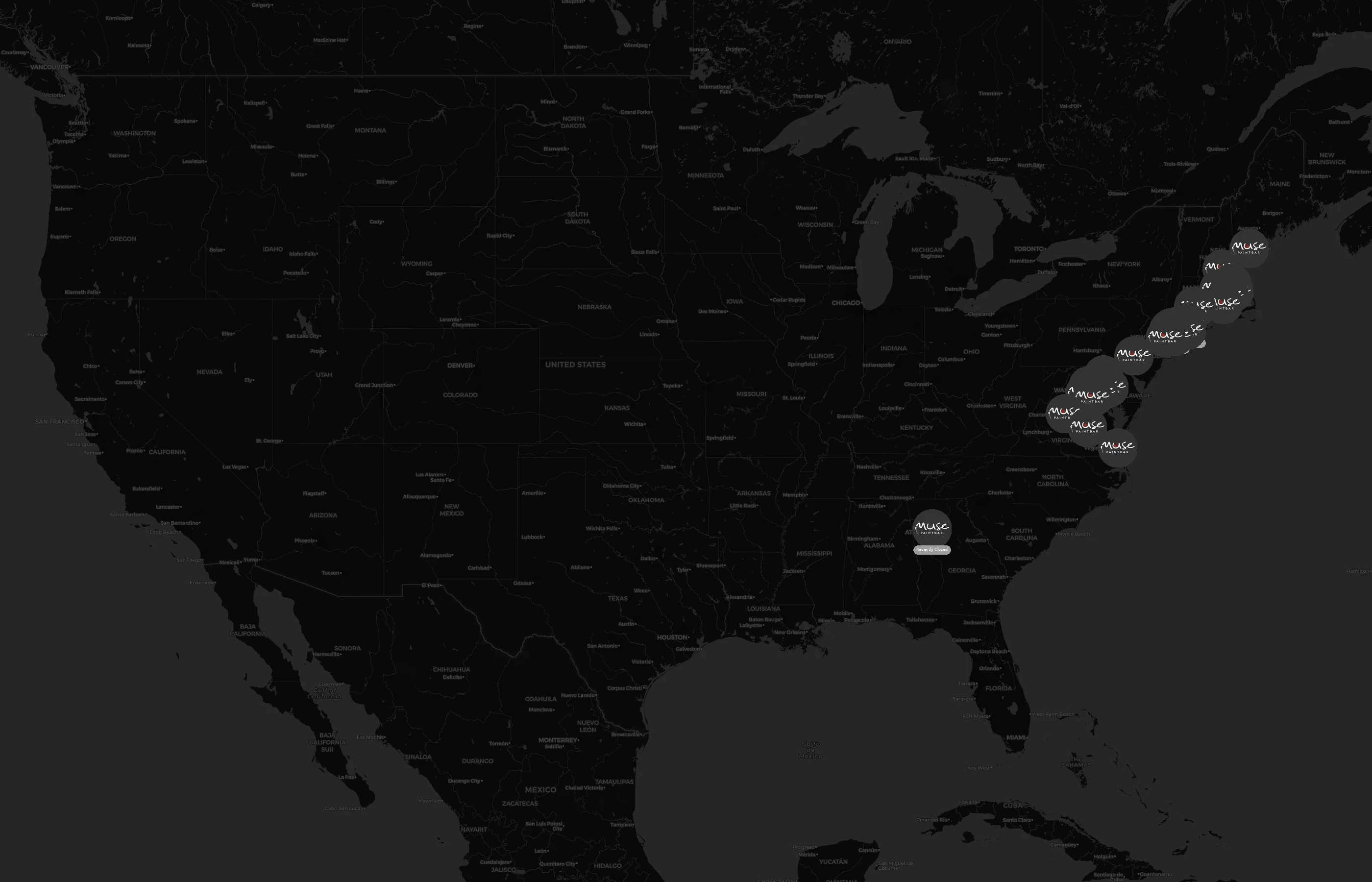 Street-level clusters show corridors where multiple Muse Paintbar locations sit within the same neighborhood indicating strong local presence and coherence. Muse Paintbar operates a total of 32 nationwide.