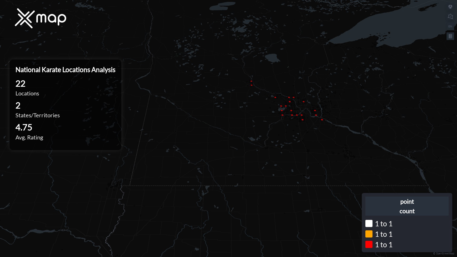 Street-level clusters show corridors where multiple National Karate locations sit within the same neighborhood indicating strong local presence and coherence. National Karate operates a total of 22 nationwide.
