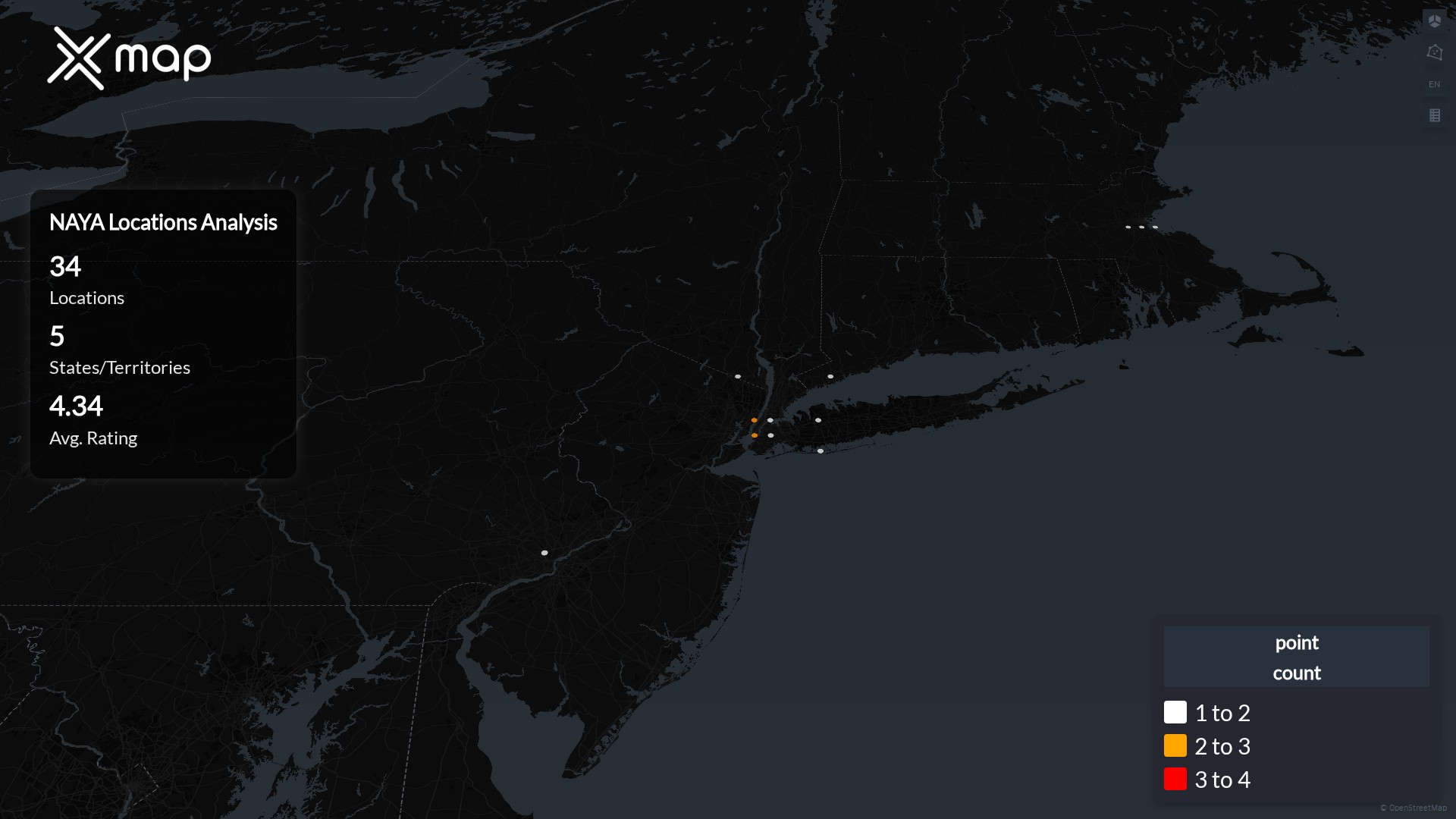 Street-level clusters show corridors where multiple NAYA locations sit within the same neighborhood indicating strong local presence and coherence. NAYA operates a total of 34 nationwide.