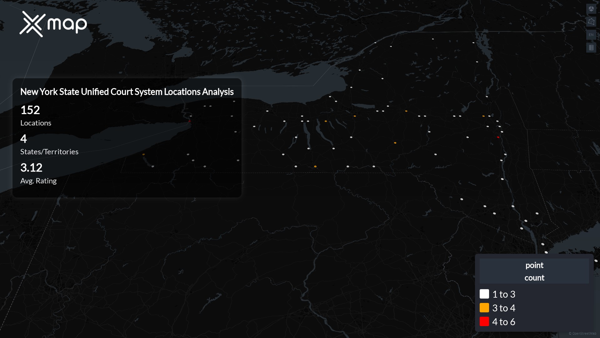 New York State Unified Court System POI data enables clear measurement of footprint and demand. Analysts can rank states and cities by location count, compare coverage on a per-capita basis, and use traffic scores and review volumes to spot high-performing markets and under-served pockets. The result is an objective view of saturation, growth opportunities, and performance outliers.