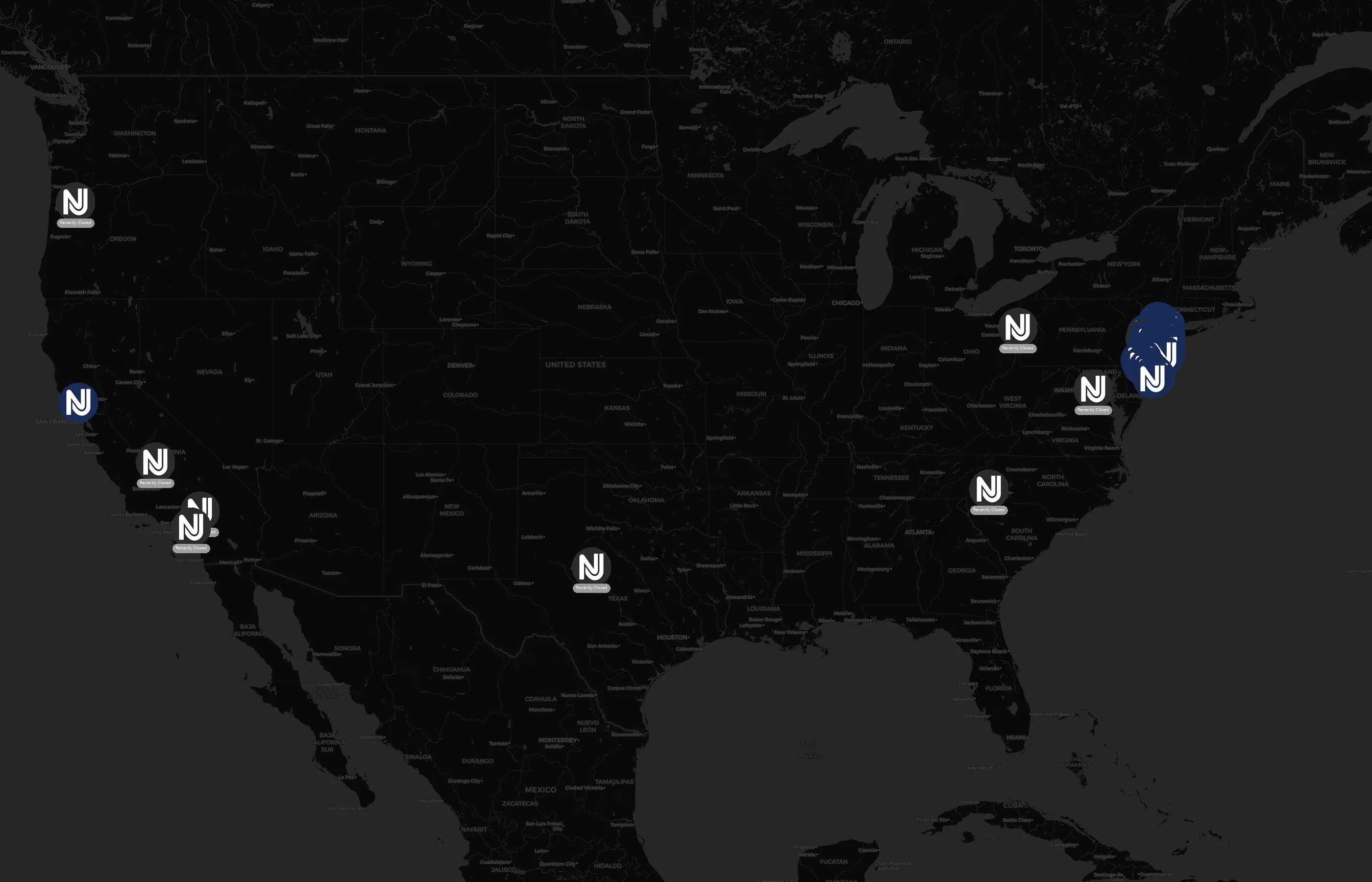 Street-level clusters show corridors where multiple NJ Transit locations sit within the same neighborhood indicating strong local presence and coherence. NJ Transit operates a total of 127 nationwide.