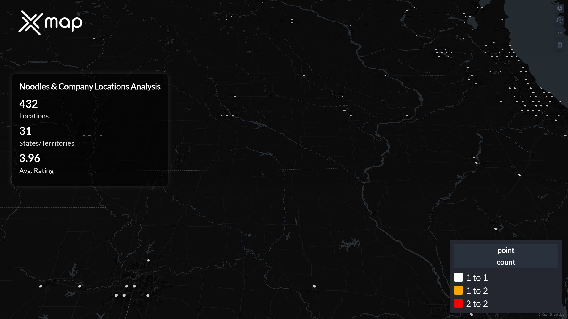 Street-level clusters show corridors where multiple Noodles & Company locations sit within the same neighborhood indicating strong local presence and coherence. Noodles & Company operates a total of 432 nationwide.