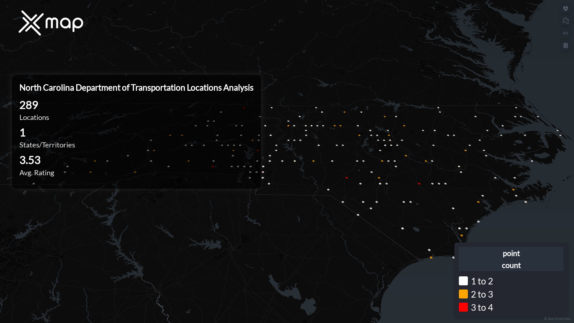 North Carolina Department of Transportation POI data enables clear measurement of footprint and demand. Analysts can rank states and cities by location count, compare coverage on a per-capita basis, and use traffic scores and review volumes to spot high-performing markets and under-served pockets. The result is an objective view of saturation, growth opportunities, and performance outliers.