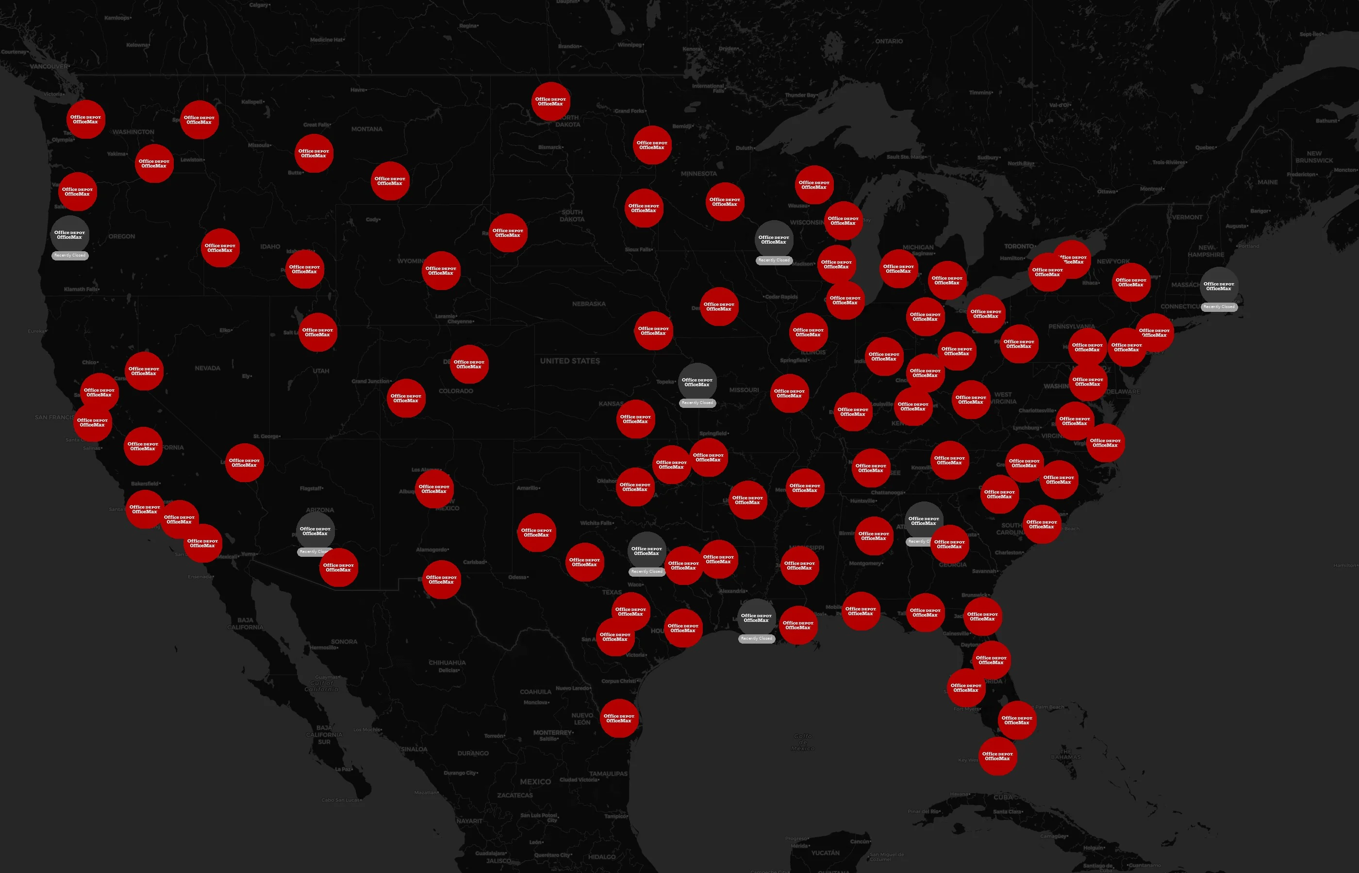 Street-level clusters show corridors where multiple Office Depot locations sit within the same neighborhood indicating strong local presence and coherence. Office Depot operates a total of 1565 nationwide.