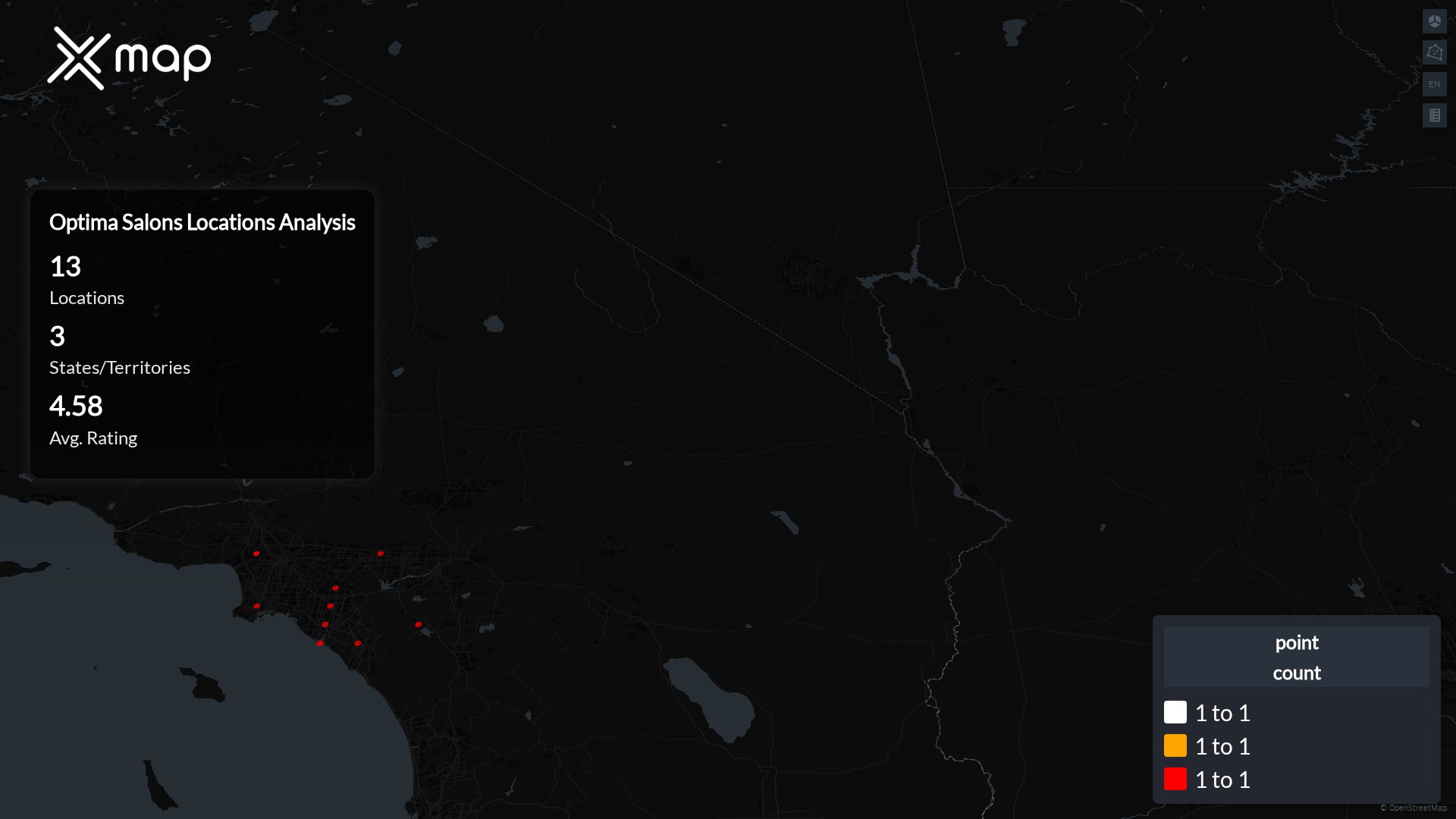 Street-level clusters show corridors where multiple Optima Salons locations sit within the same neighborhood indicating strong local presence and coherence. Optima Salons operates a total of 13 nationwide.