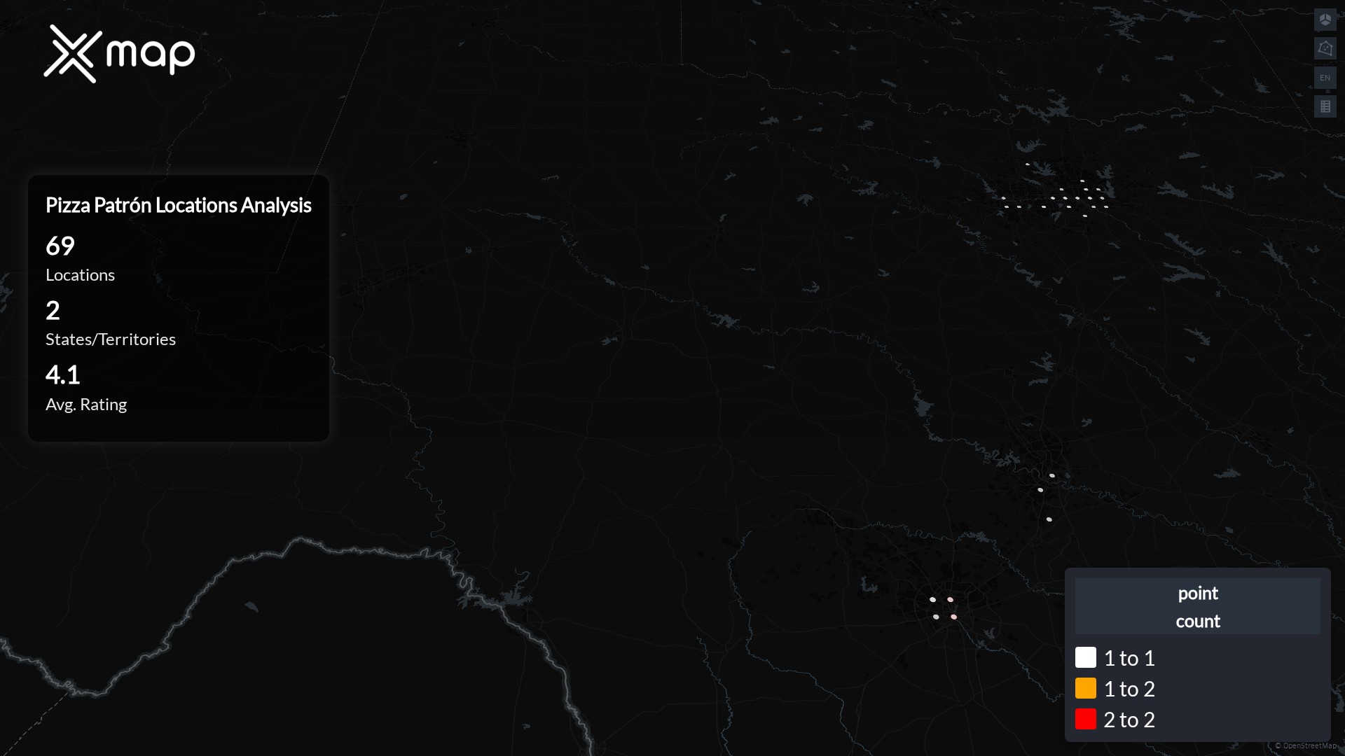 Street-level clusters show corridors where multiple Pizza Patrón locations sit within the same neighborhood indicating strong local presence and coherence. Pizza Patrón operates a total of 69 nationwide.