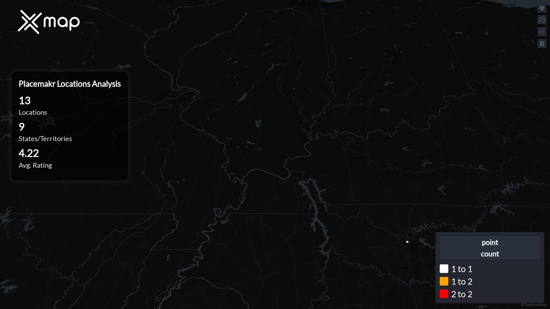 Street-level clusters show corridors where multiple Placemakr locations sit within the same neighborhood indicating strong local presence and coherence. Placemakr operates a total of 13 nationwide.