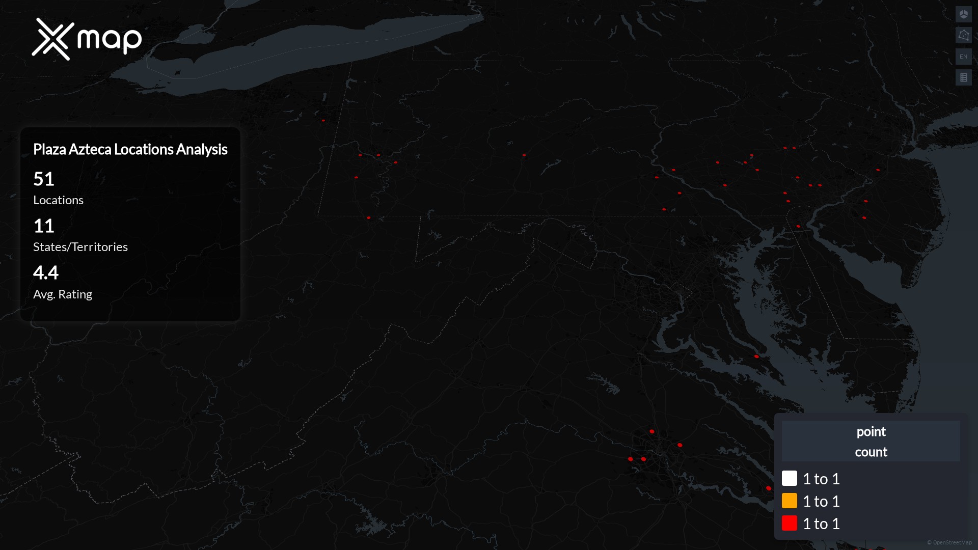 Plaza Azteca operates 51 United States of America locations across 11 states. Largest clusters are in Pennsylvania, Virginia, and New Jersey; the top 10 states contain 98.0% of sites. Coverage is thinner in Massachusetts, Ohio, and West Virginia.
