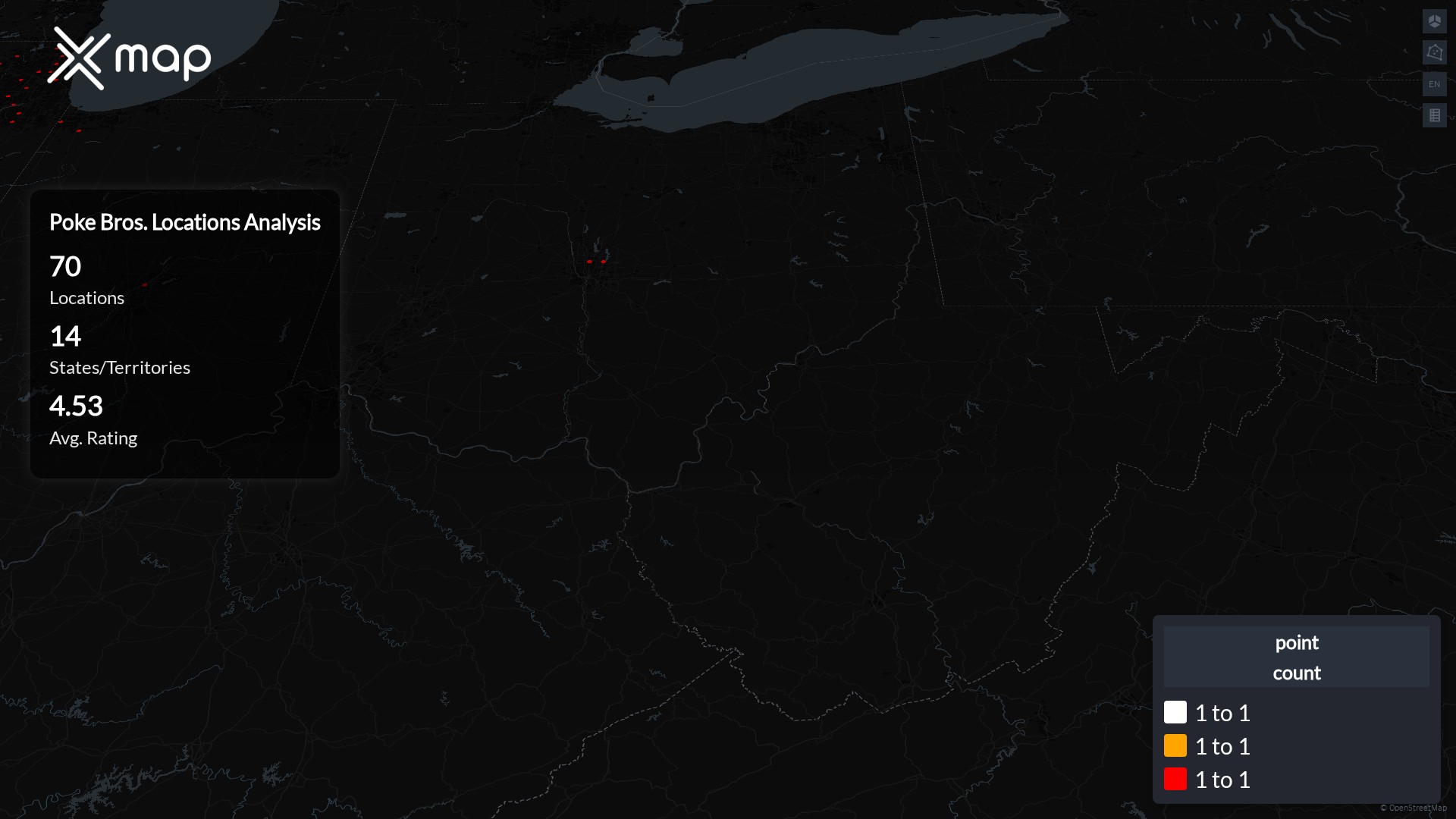 Poke Bros. POI data enables clear measurement of footprint and demand. Analysts can rank states and cities by location count, compare coverage on a per-capita basis, and use traffic scores and review volumes to spot high-performing markets and under-served pockets. The result is an objective view of saturation, growth opportunities, and performance outliers.