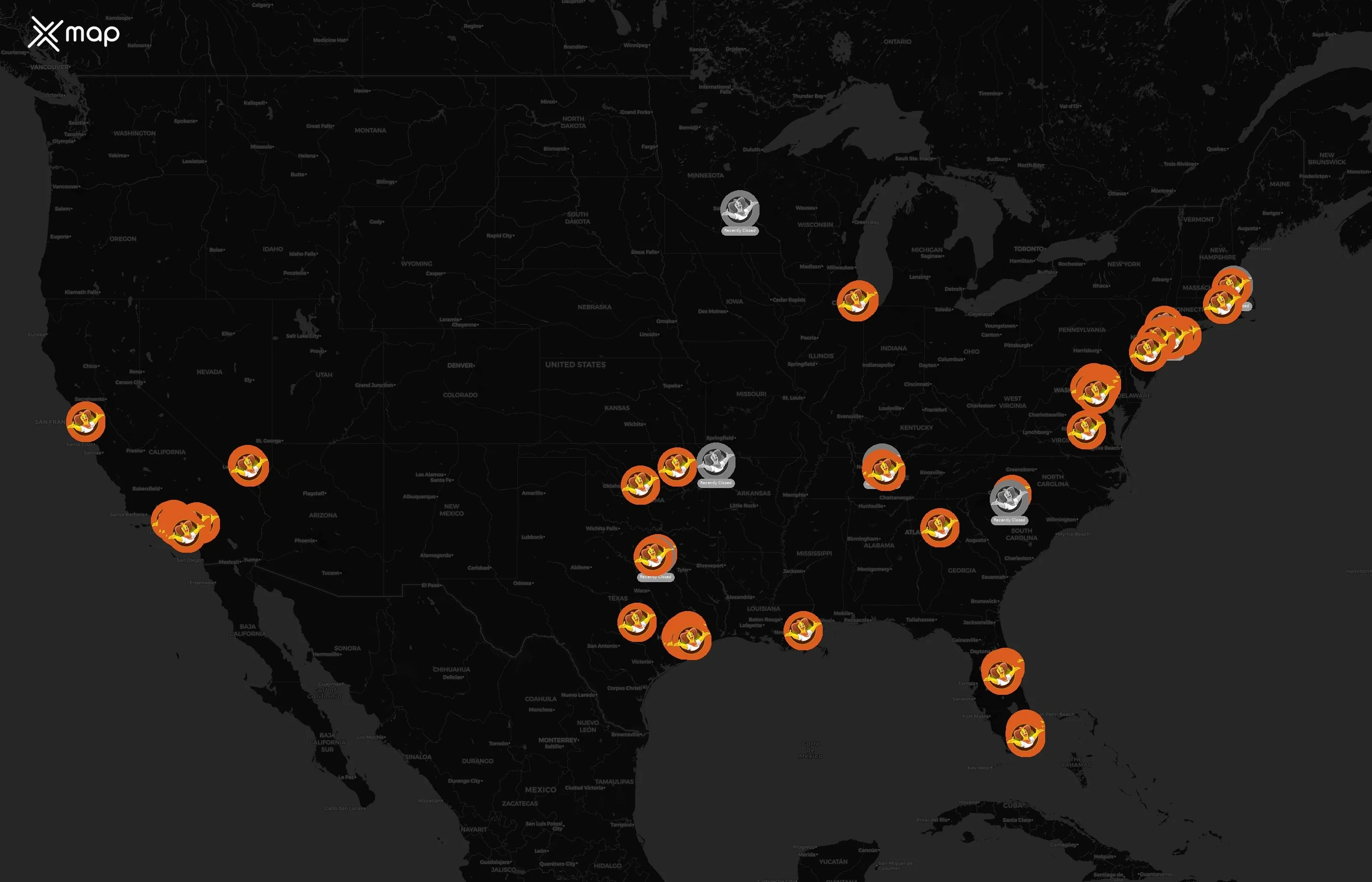 Street-level clusters show corridors where multiple Pollo Campero locations sit within the same neighborhood indicating strong local presence and coherence. Pollo Campero operates a total of 78 nationwide.