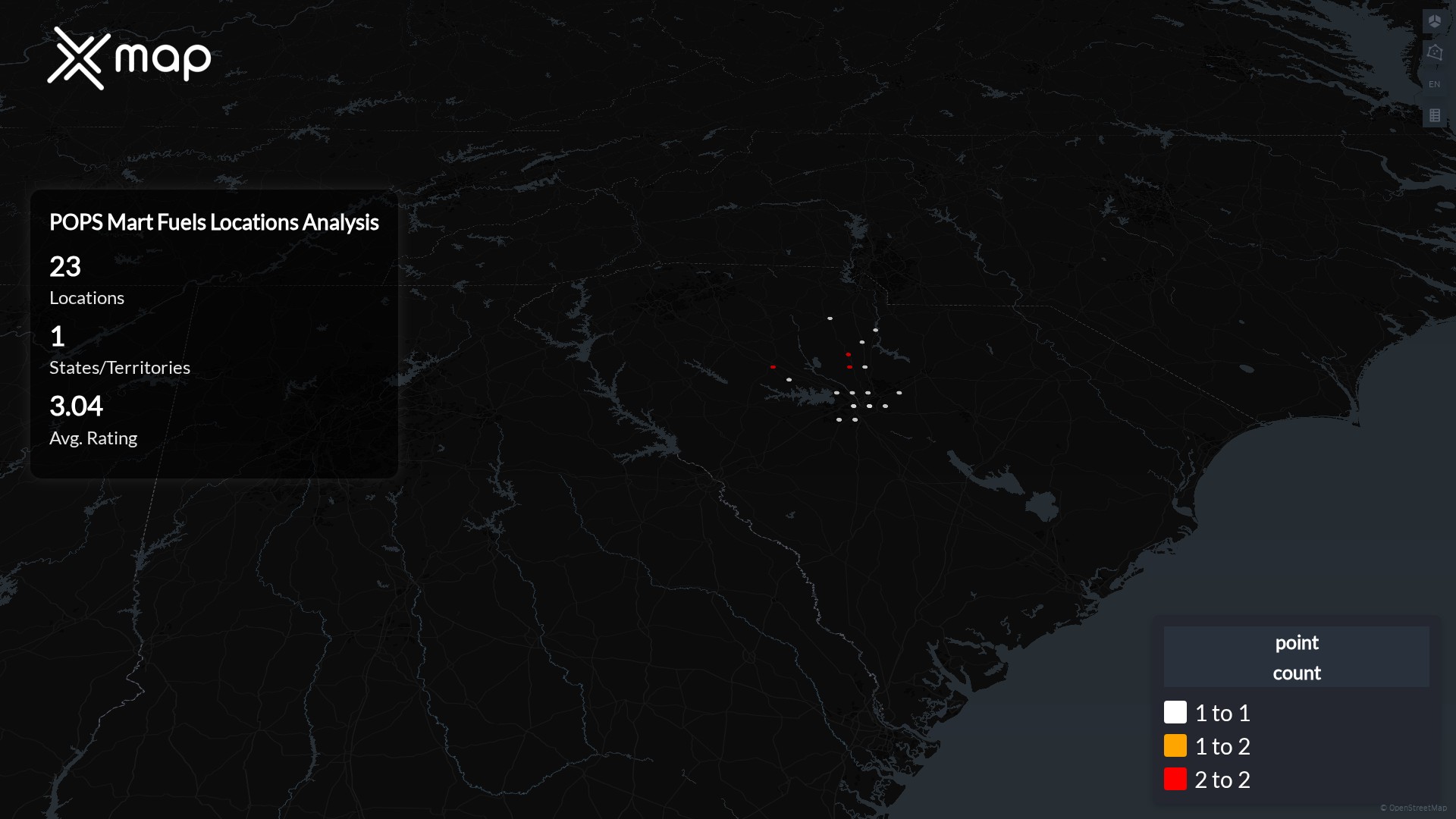 Street-level clusters show corridors where multiple POPS Mart Fuels locations sit within the same neighborhood indicating strong local presence and coherence. POPS Mart Fuels operates a total of 23 nationwide.