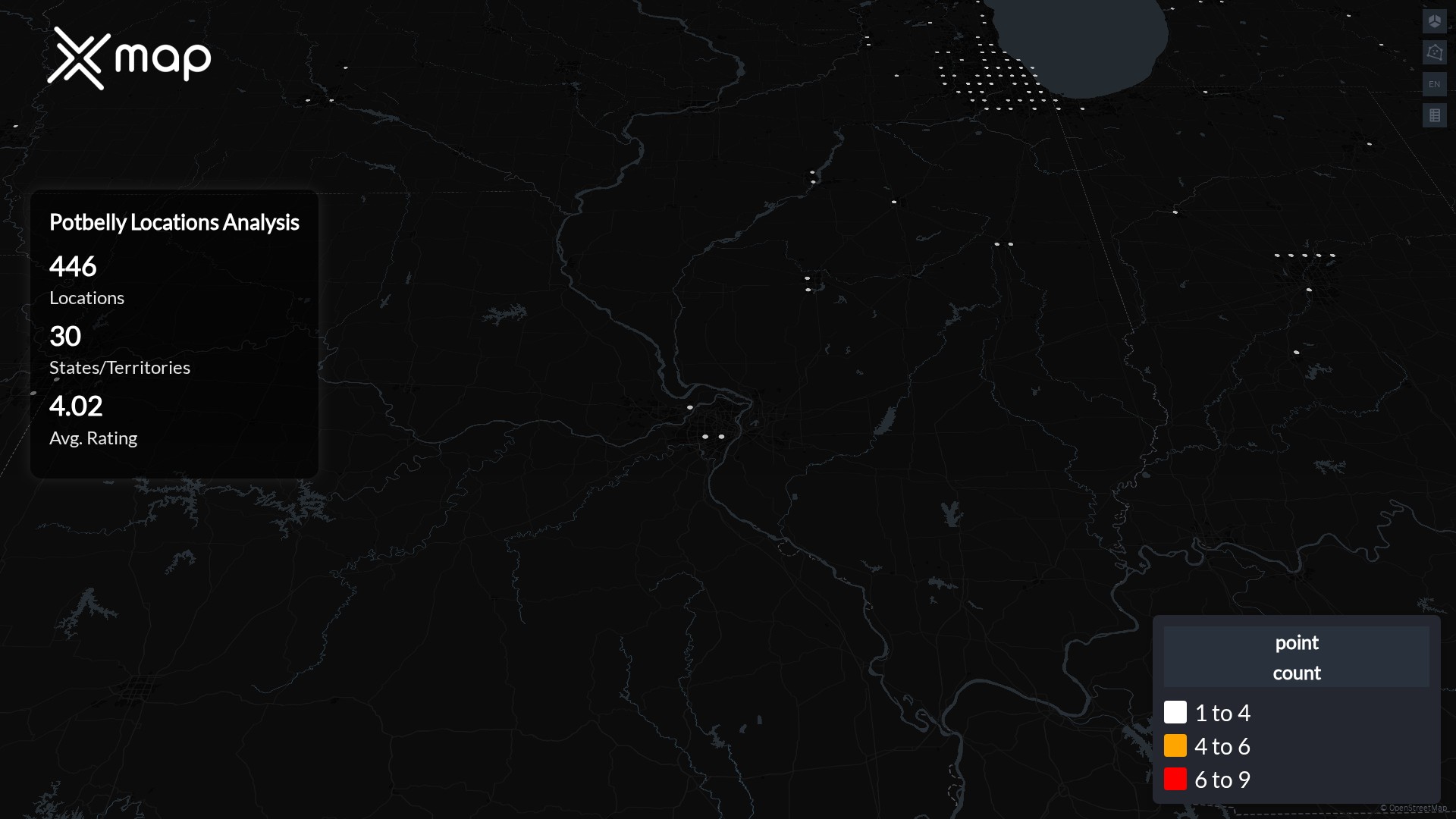 Street-level clusters show corridors where multiple Potbelly locations sit within the same neighborhood indicating strong local presence and coherence. Potbelly operates a total of 446 nationwide.