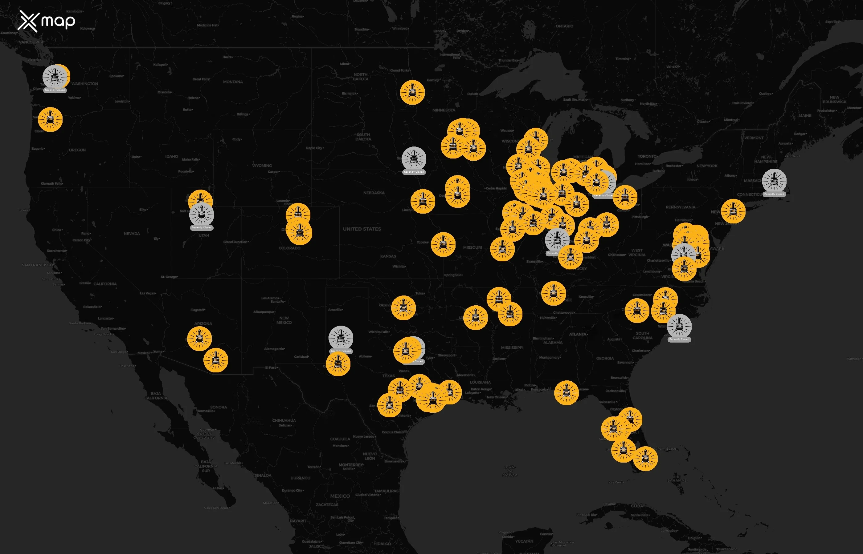 Locations concentrate around major metros such as Cook, District of Columbia, Harris, Dallas, and Hennepin. The top 10 cities account for 40.4% of U.S. sites.