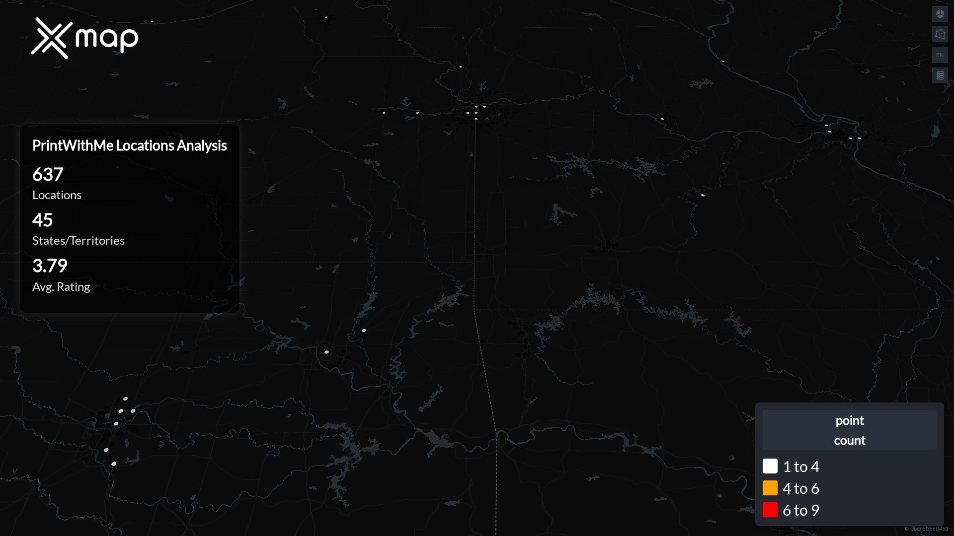 PrintWithMe has 637 locations across the United States of America. The key variables shows the most infleuntial aspects for PrintWithMe locations nationwide. This provides a closer look of how PrintWithMe is operating from different prespectives.