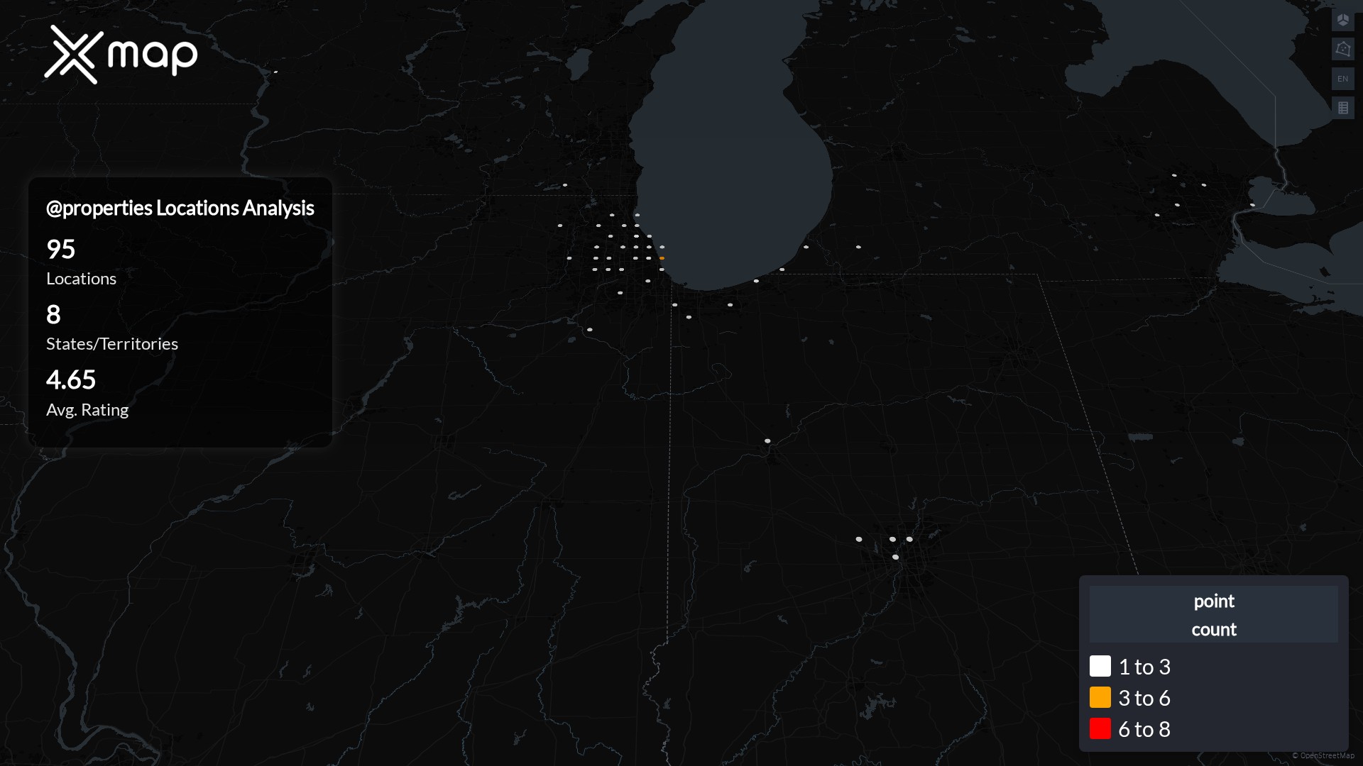 Street-level clusters show corridors where multiple @properties locations sit within the same neighborhood indicating strong local presence and coherence. @properties operates a total of 95 nationwide.
