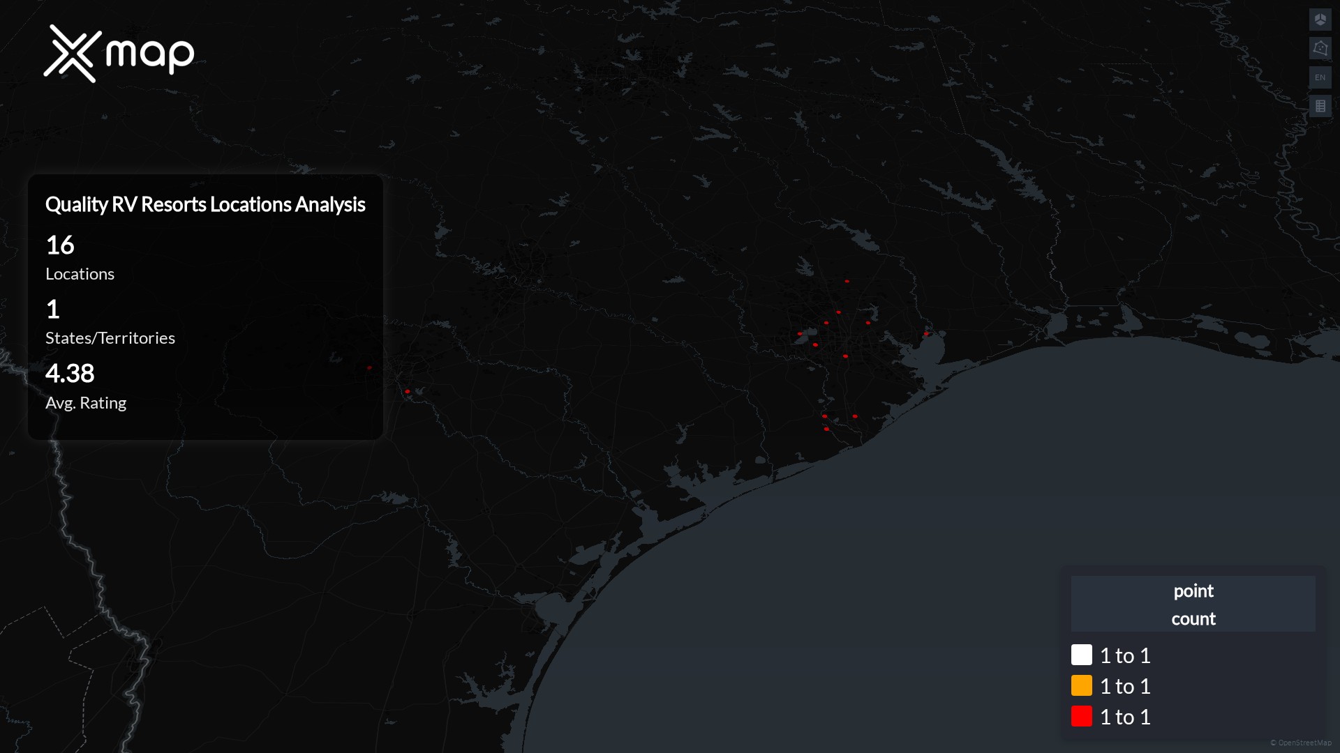 Street-level clusters show corridors where multiple Quality RV Resorts locations sit within the same neighborhood indicating strong local presence and coherence. Quality RV Resorts operates a total of 16 nationwide.
