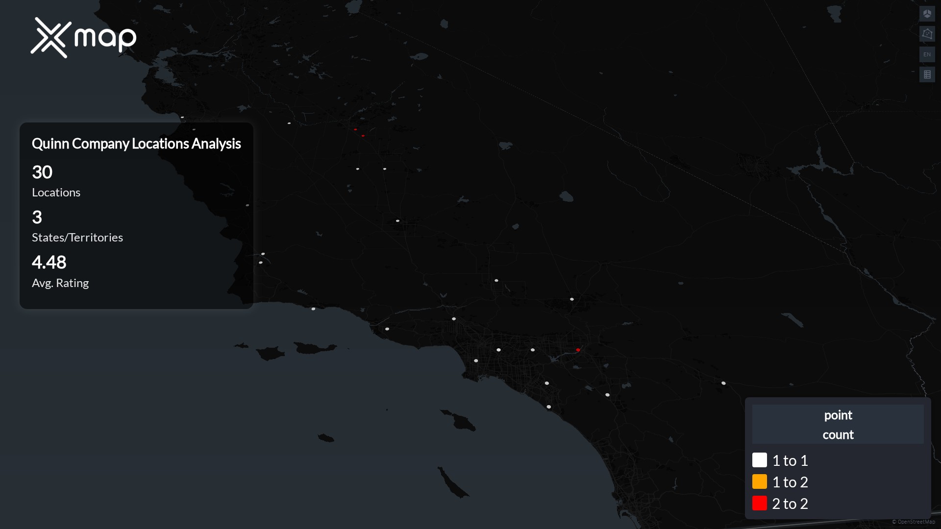 Quinn Company POI data enables clear measurement of footprint and demand. Analysts can rank states and cities by location count, compare coverage on a per-capita basis, and use traffic scores and review volumes to spot high-performing markets and under-served pockets. The result is an objective view of saturation, growth opportunities, and performance outliers.