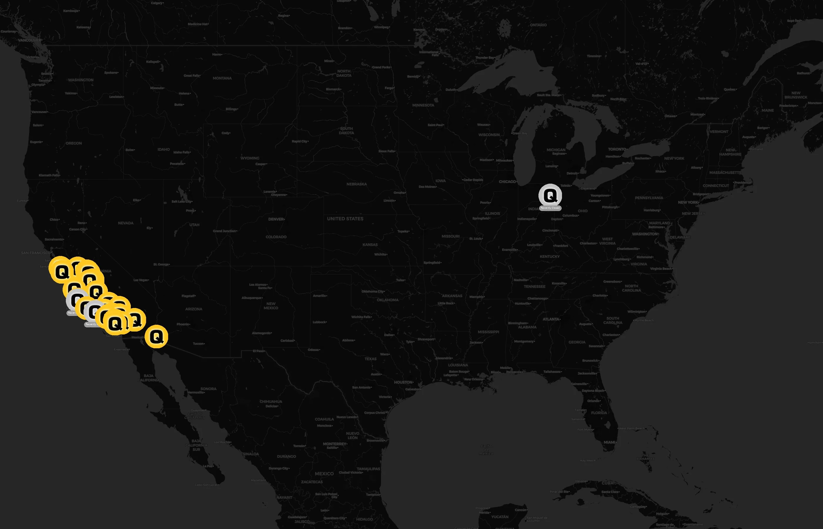 Street-level clusters show corridors where multiple Quinn Company locations sit within the same neighborhood indicating strong local presence and coherence. Quinn Company operates a total of 30 nationwide.