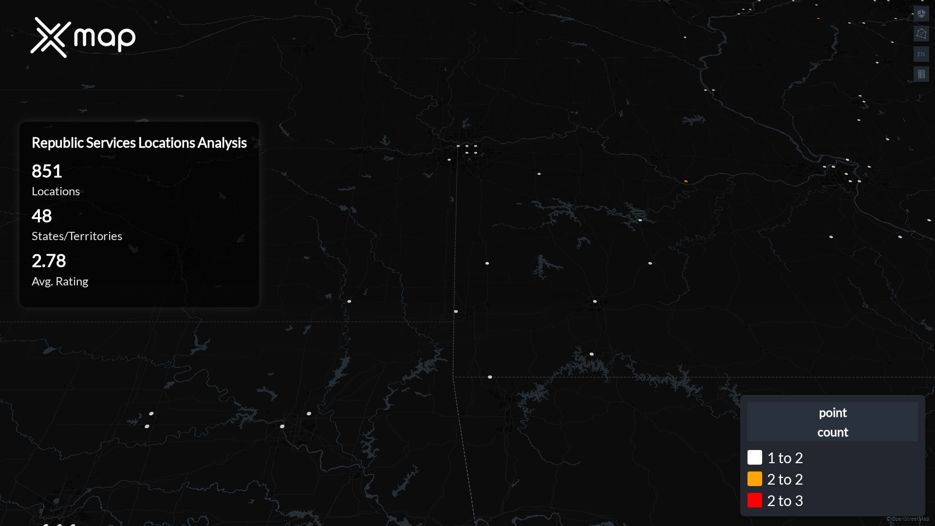 Republic Services POI data enables clear measurement of footprint and demand. Analysts can rank states and cities by location count, compare coverage on a per-capita basis, and use traffic scores and review volumes to spot high-performing markets and under-served pockets. The result is an objective view of saturation, growth opportunities, and performance outliers.