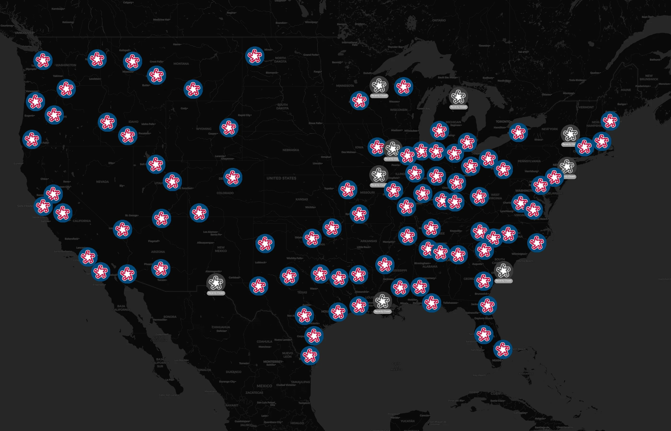Locations concentrate around major metros such as Cook, Harris, LosAngeles, SanDiego, and Wayne. The top 10 cities account for 10.8% of U.S. sites.