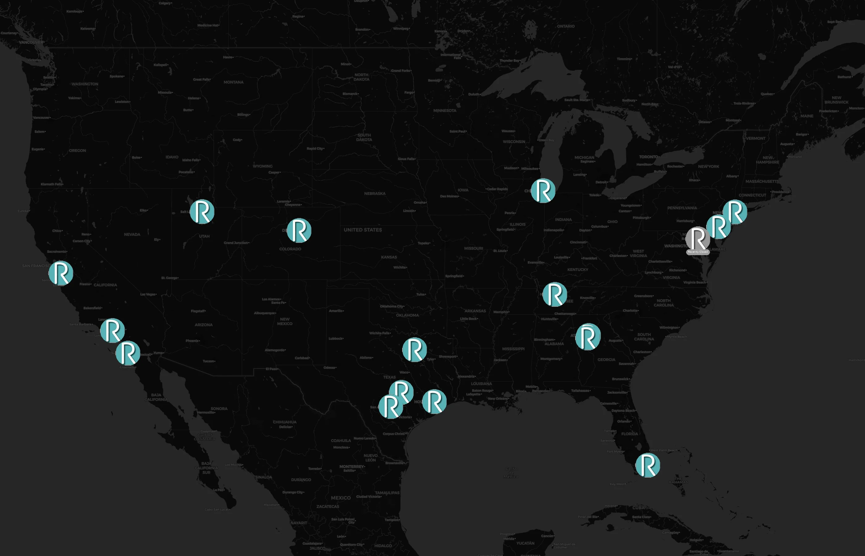 Reventals operates 17 United States of America locations across 11 states. Largest clusters are in Texas, California, and Georgia; the top 10 states contain 94.1% of sites. Coverage is thinner in Pennsylvania, Tennessee, and Utah.