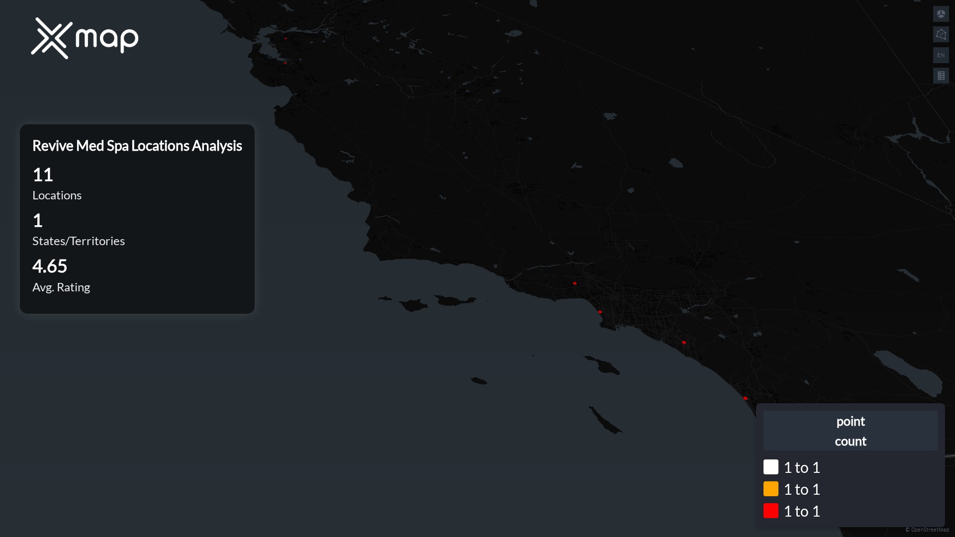 Street-level clusters show corridors where multiple Revive Med Spa locations sit within the same neighborhood indicating strong local presence and coherence. Revive Med Spa operates a total of 11 nationwide.
