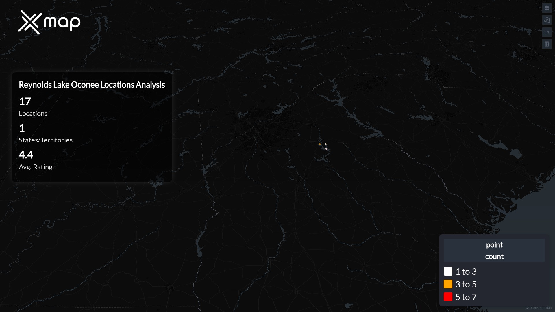 Reynolds Lake Oconee POI data enables clear measurement of footprint and demand. Analysts can rank states and cities by location count, compare coverage on a per-capita basis, and use traffic scores and review volumes to spot high-performing markets and under-served pockets. The result is an objective view of saturation, growth opportunities, and performance outliers.
