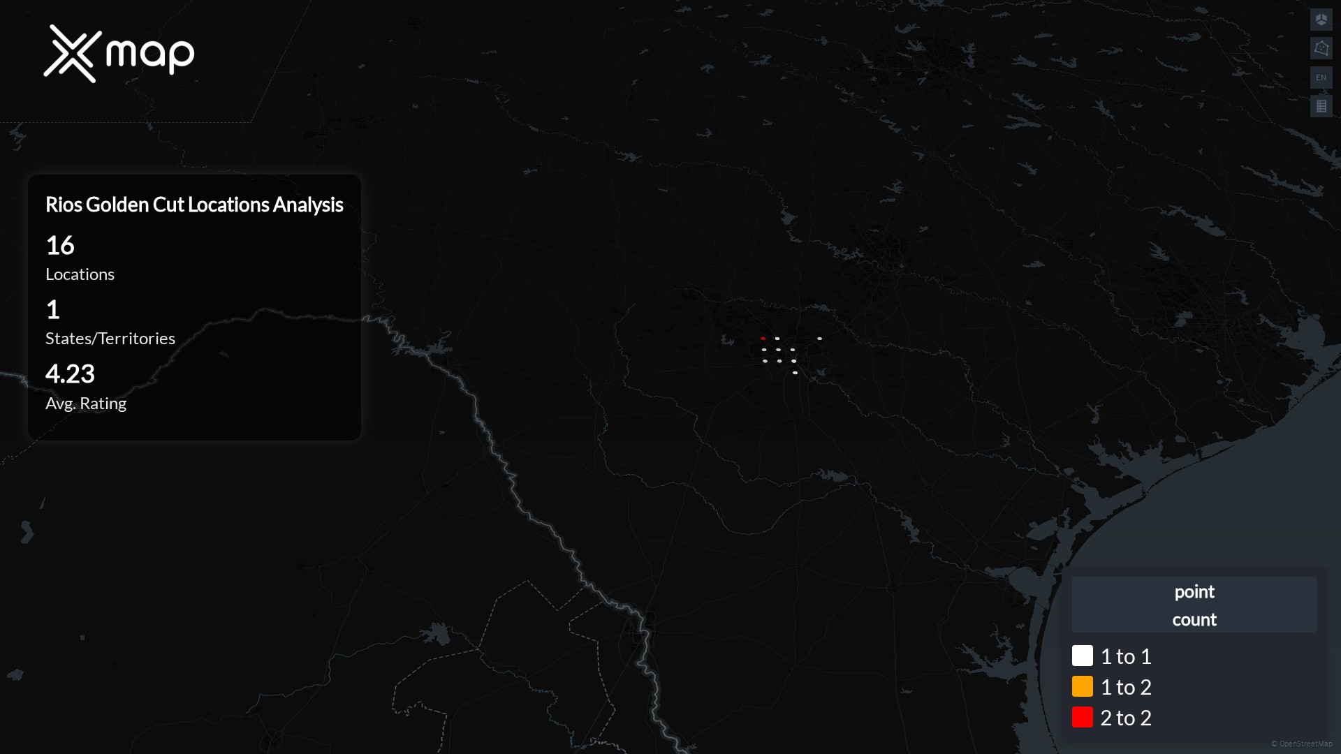 Rios Golden Cut has 16 locations in Texas, with 2 classified as busy, representing 12.5% of its total sites in the state. Texas is the only state listed for the brand in the United States of America.