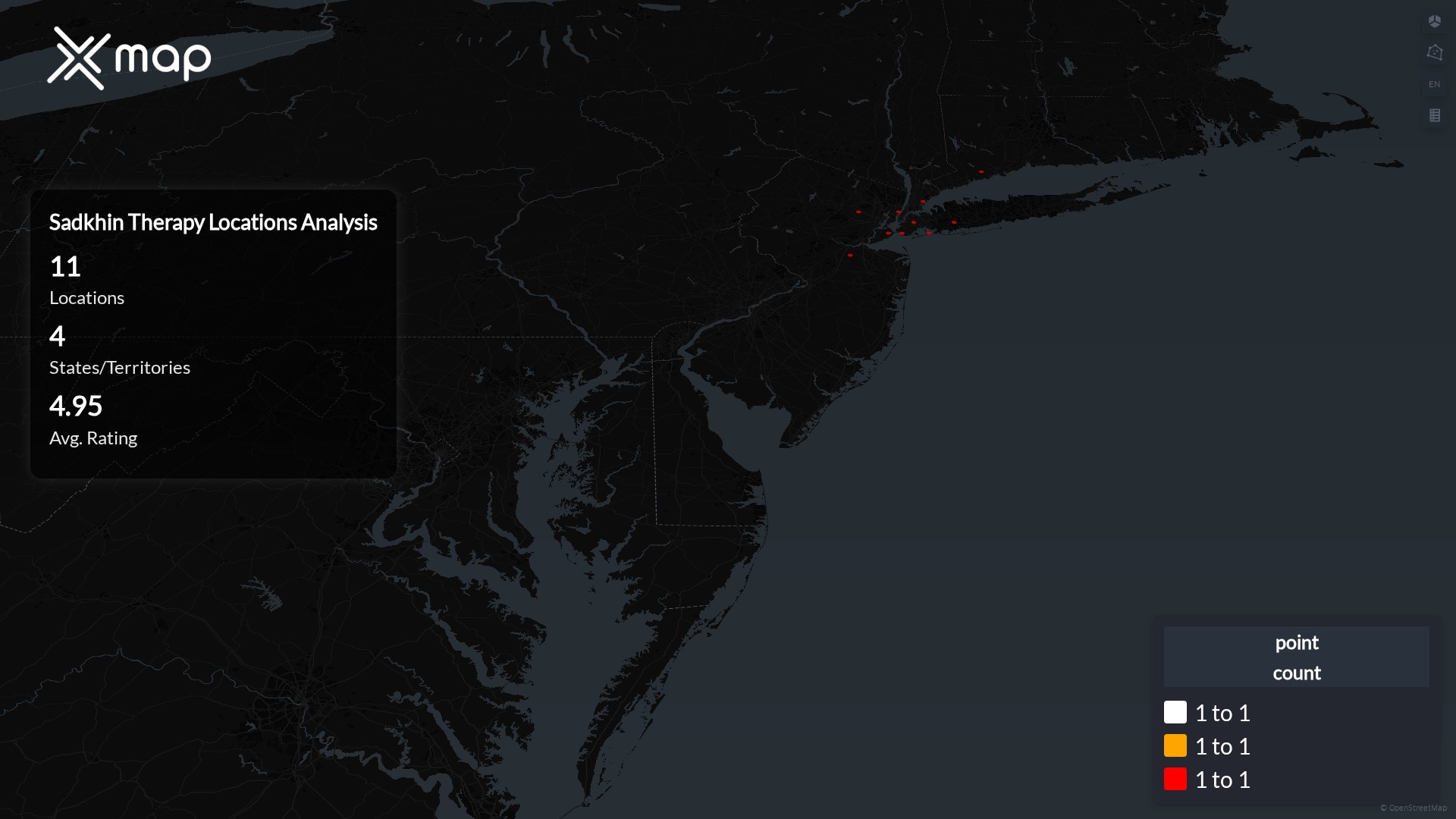 Street-level clusters show corridors where multiple Sadkhin Therapy locations sit within the same neighborhood indicating strong local presence and coherence. Sadkhin Therapy operates a total of 11 nationwide.