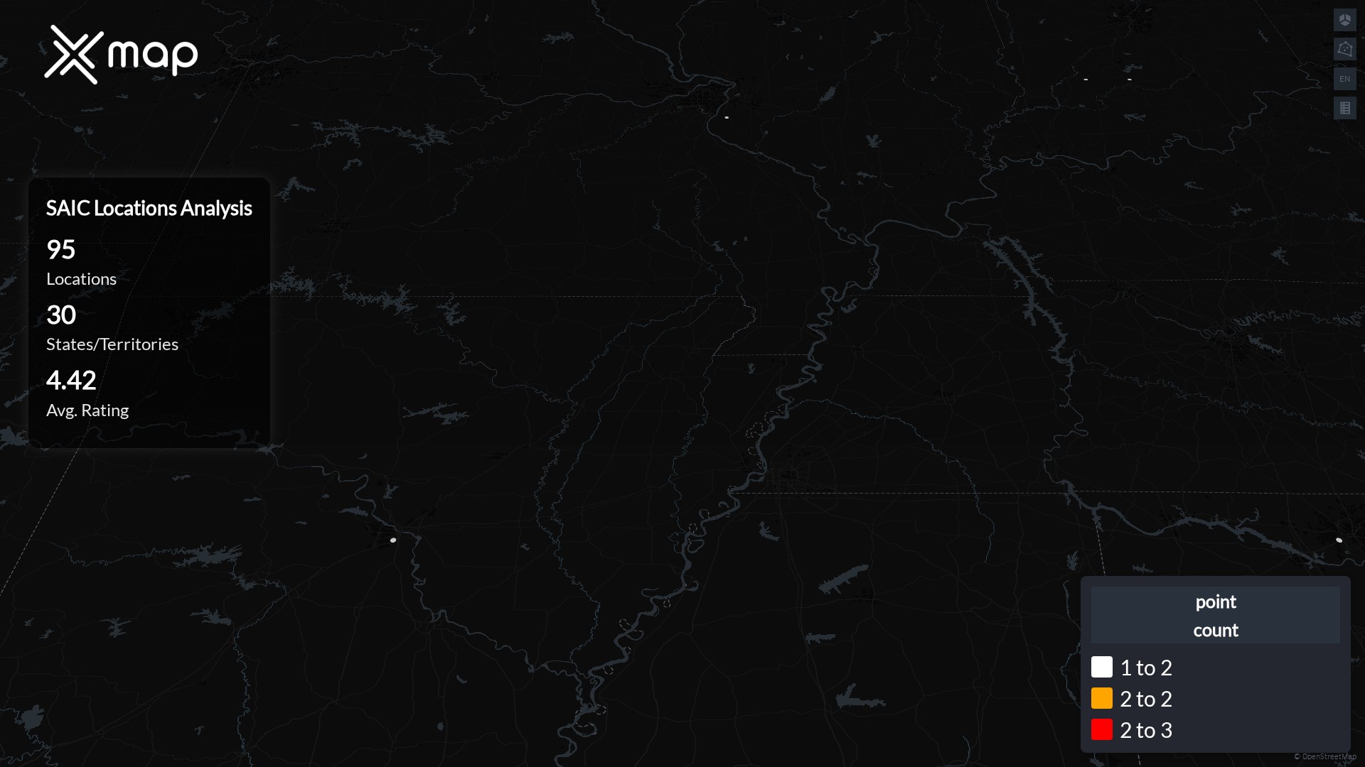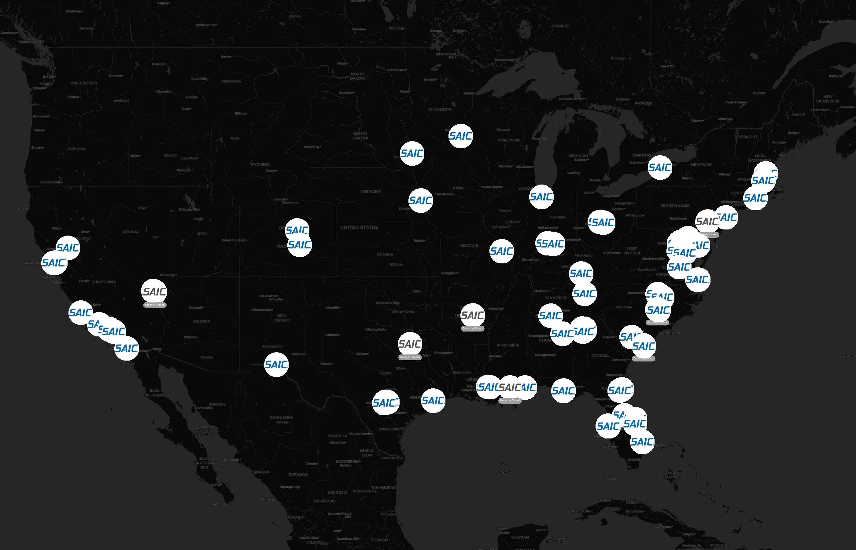 Street-level clusters show corridors where multiple SAIC locations sit within the same neighborhood indicating strong local presence and coherence. SAIC operates a total of 95 nationwide.