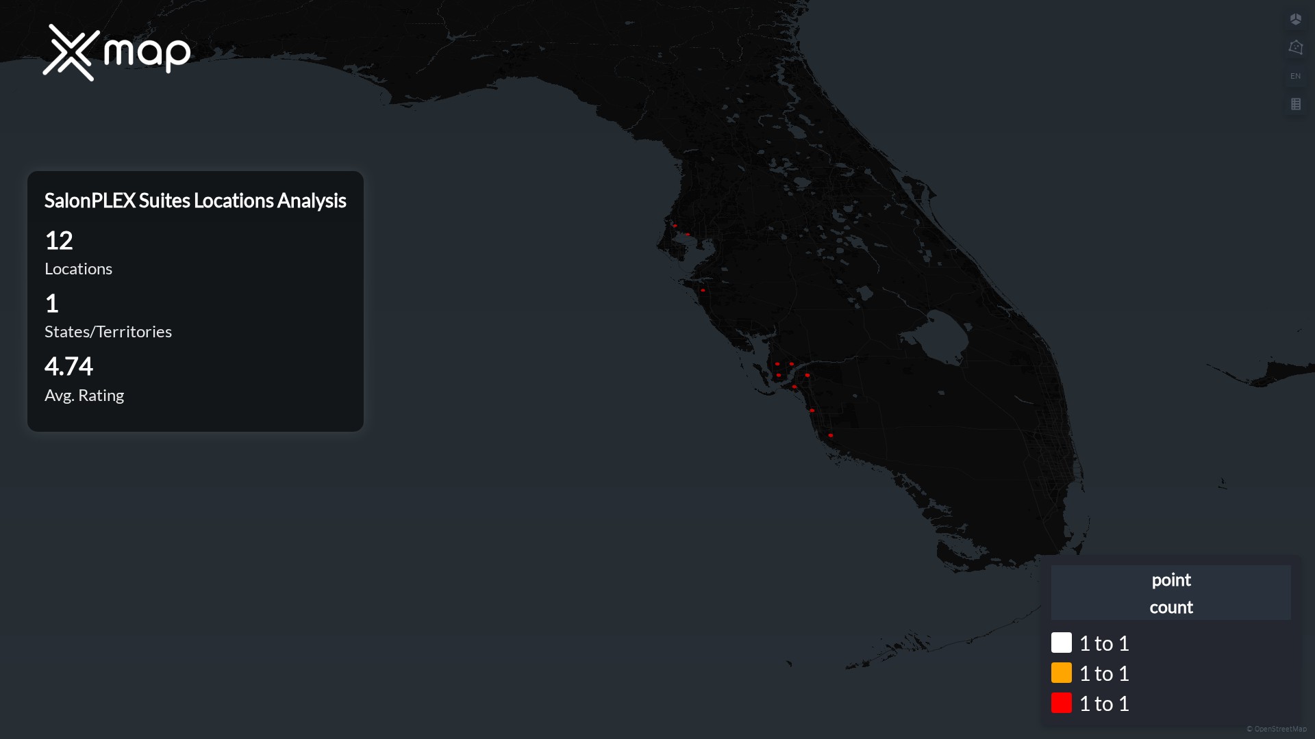Street-level clusters show corridors where multiple SalonPLEX Suites locations sit within the same neighborhood indicating strong local presence and coherence. SalonPLEX Suites operates a total of 12 nationwide.