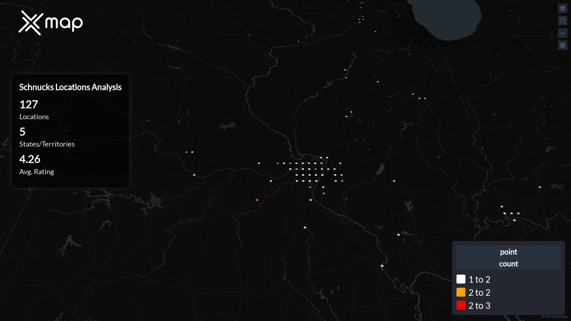 Street-level clusters show corridors where multiple Schnucks locations sit within the same neighborhood indicating strong local presence and coherence. Schnucks operates a total of 127 nationwide.