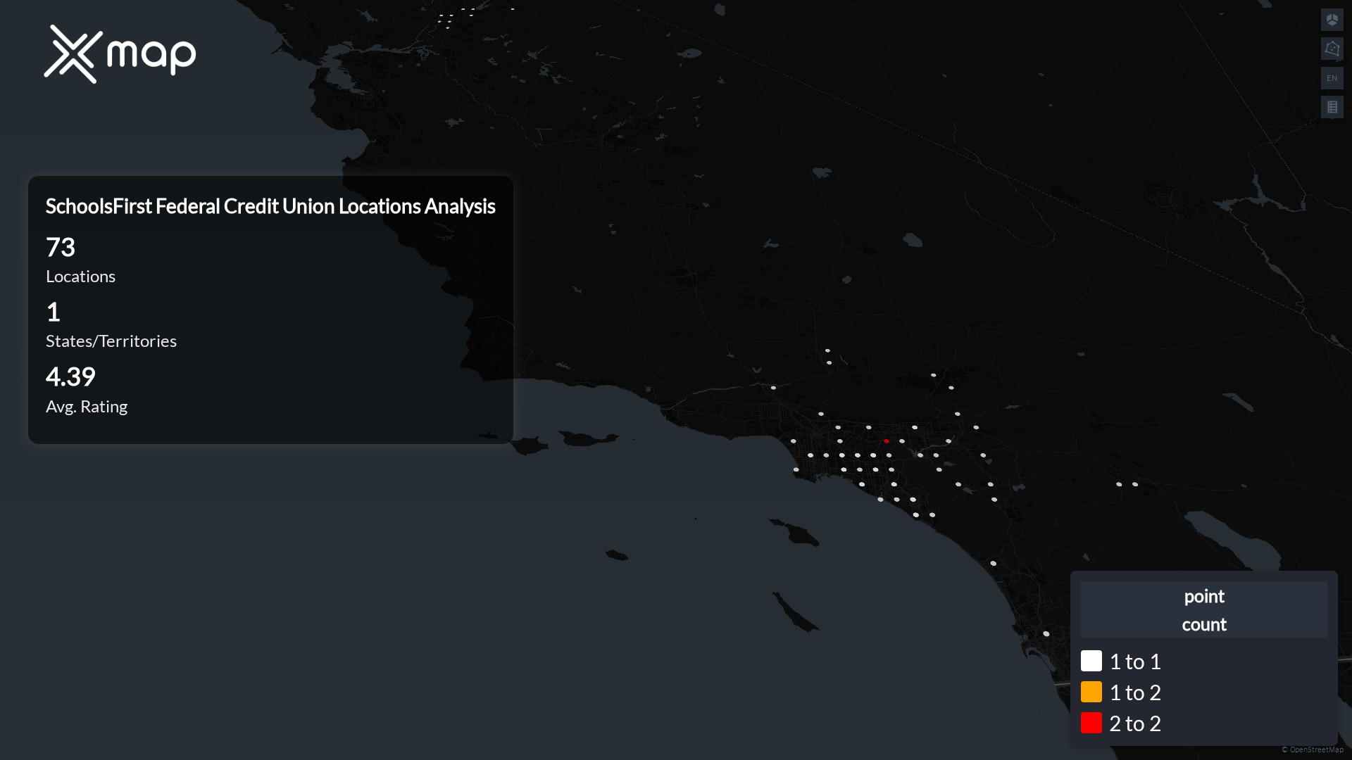 SchoolsFirst Federal Credit Union operates 73 locations in California, with 69 currently open and 4 closed. This results in an open rate of 94.5% for its branches within the state.