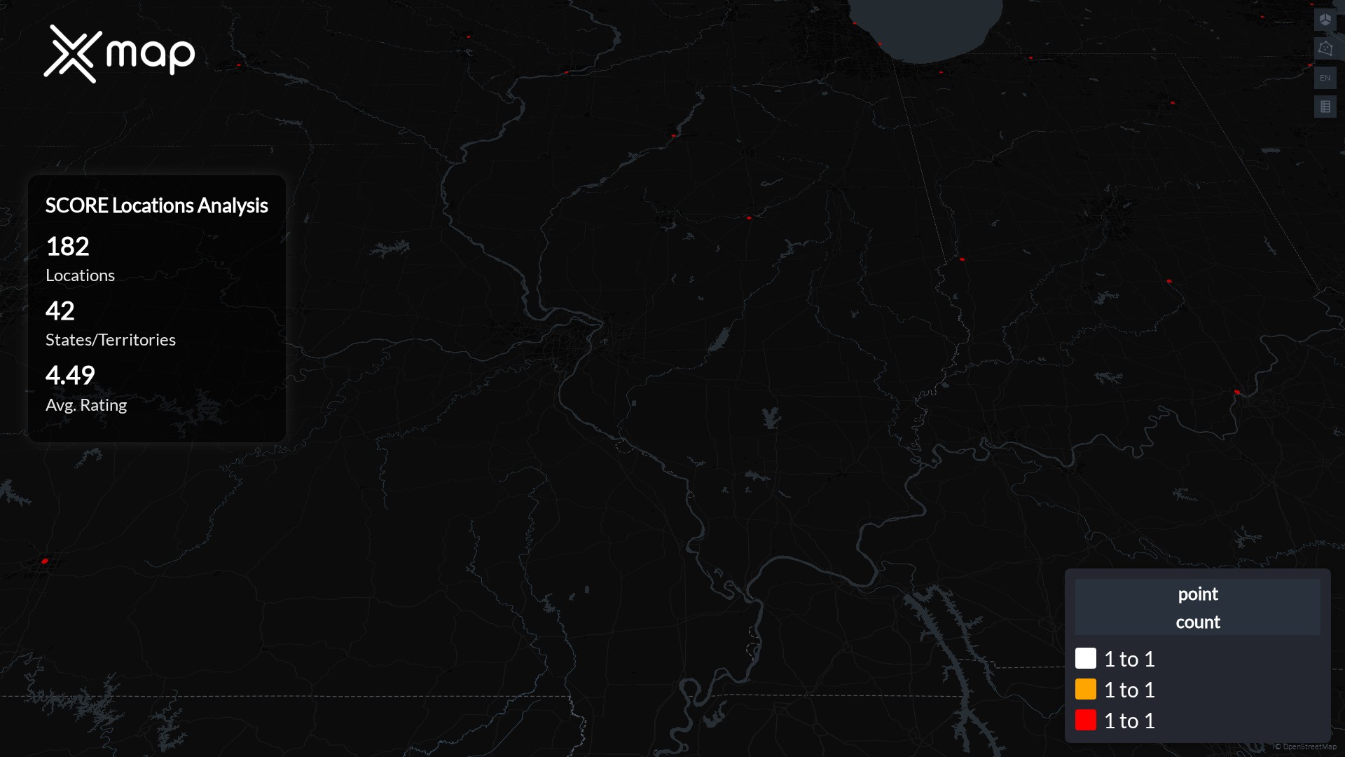 Street-level clusters show corridors where multiple SCORE locations sit within the same neighborhood indicating strong local presence and coherence. SCORE operates a total of 182 nationwide.