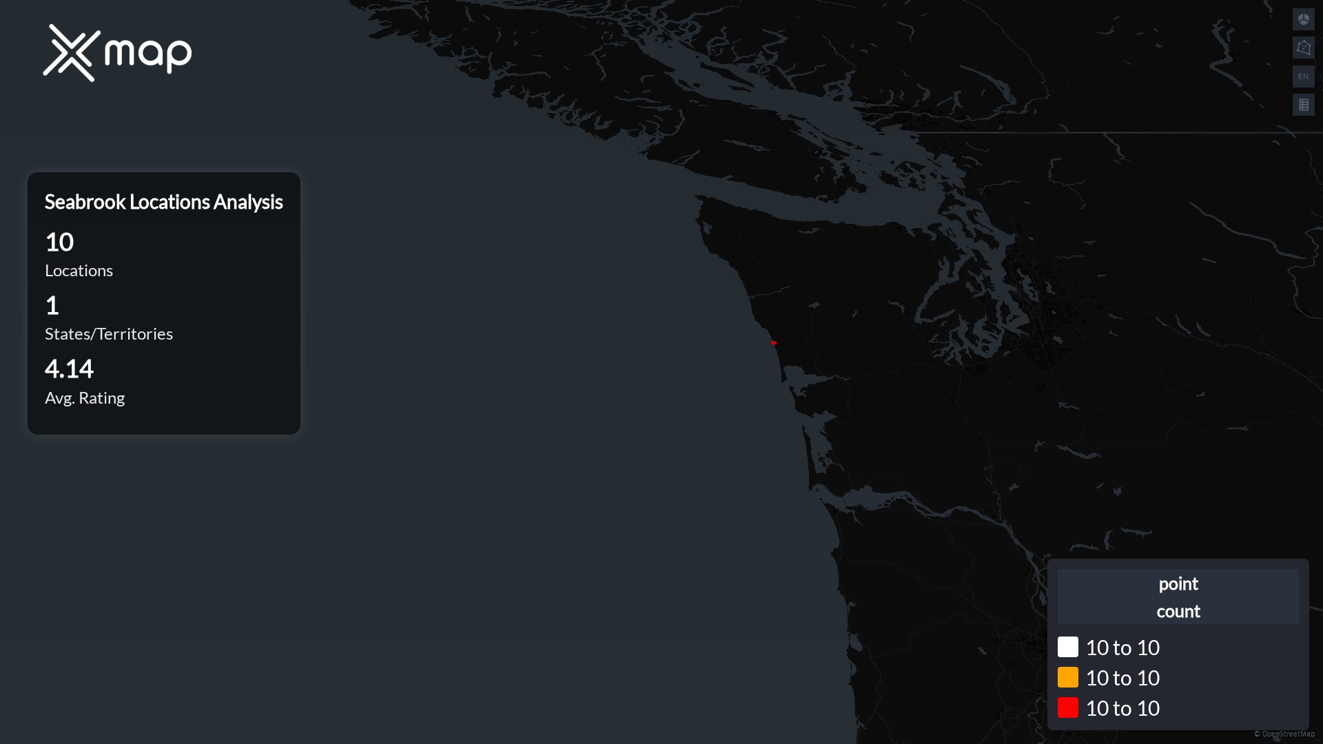 Seabrook operates 10 United States of America locations across 1 states. Largest clusters are in Washington; the top 10 states contain 100.0% of sites. Coverage is thinner in Washington.